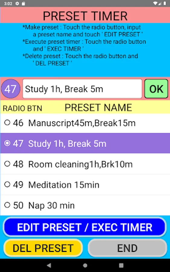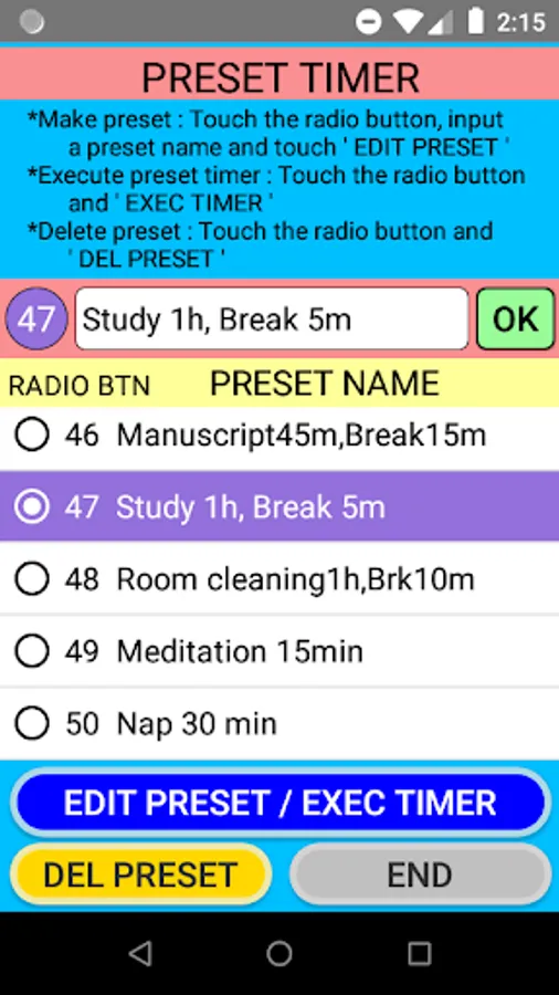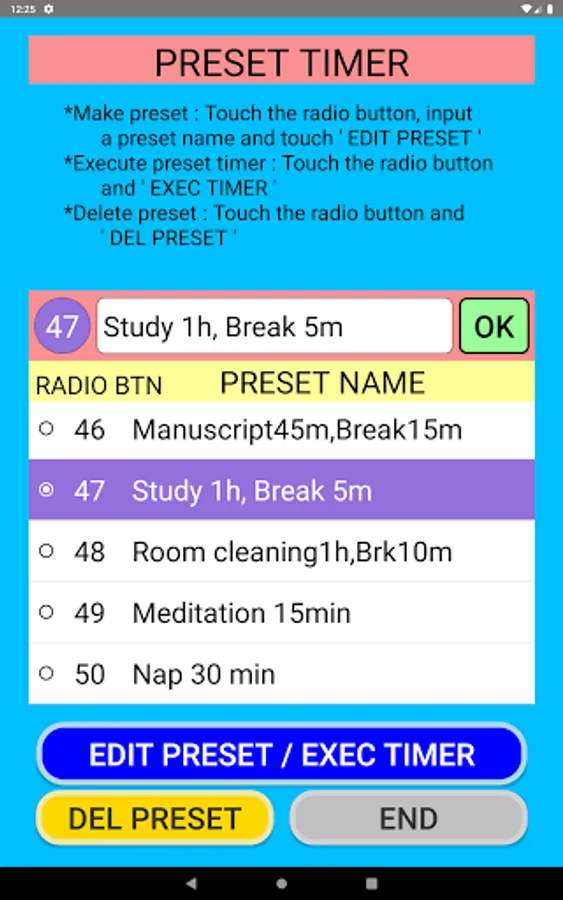 1. For each subject, You will study for 1 hour and take a 5-minute break. "Super timer pro" will inform you of the passage of 1 hour and the remaining 5 minutes. After the first subject, you can use it repeatedly just by tapping the start button.