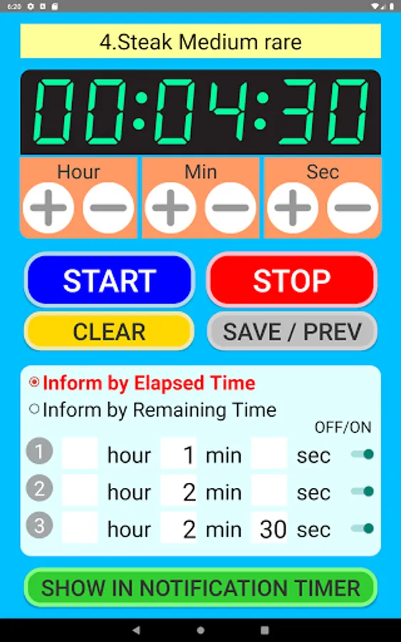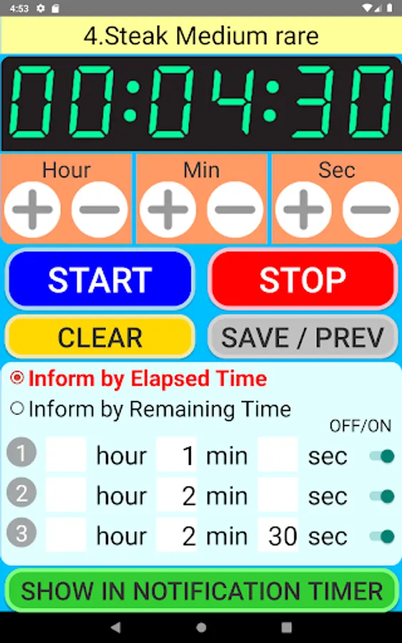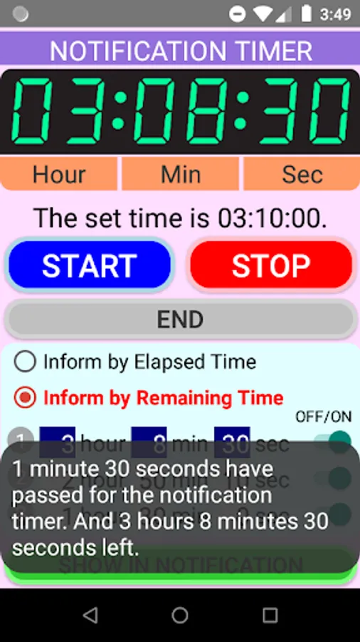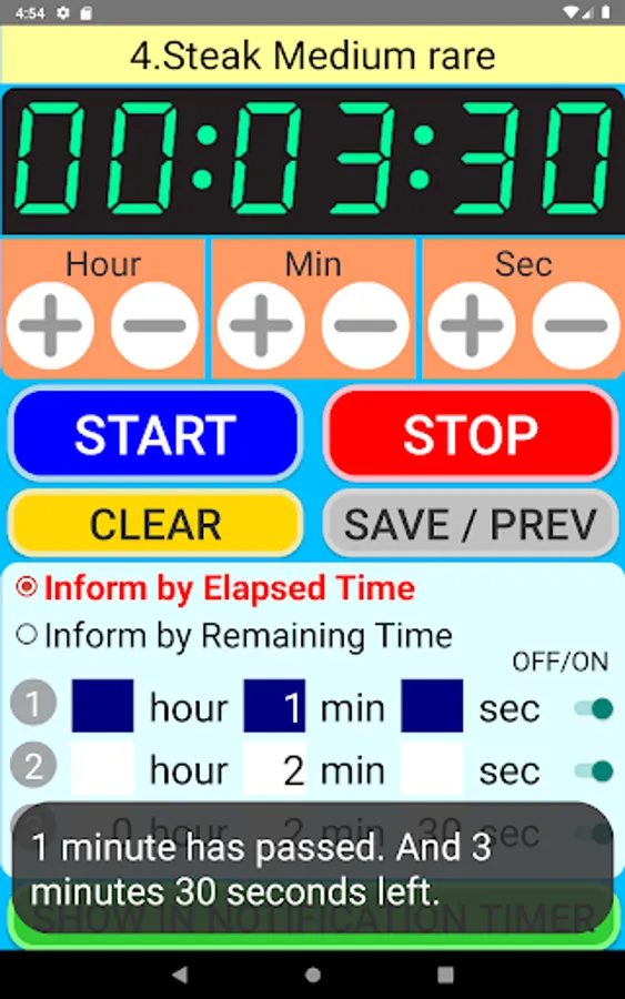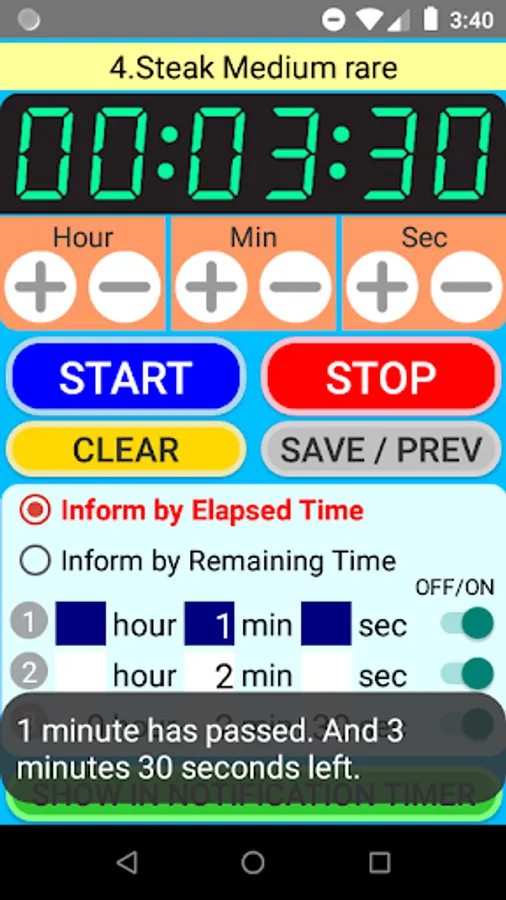 5. You can't exceed the presentation time, so you'd like to know the elapsed time and remaining time several times along the way. "Super Timer Pro" will notify you of the elapsed time and remaining time 3 times and the completion of the countdown. If you don't like making sounds during your presentation, you can use vibration.