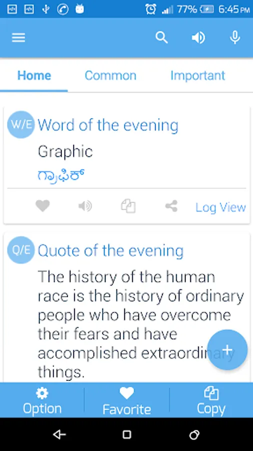 Home Screen Wallpaper: You want to learn words even if you are outside app. Yes, you are right. This is now possible with our live wallpaper feature. From drawer please select live wallpaper and you will see words with meaning on your home screen. You have lots of options to customize this wallpaper screen. Like words can be selected from favorites, history and Word of the Day section. Time frame can also be selected by you. Today, Yesterday, This week, Last week, All times and more. From wallpaper settings you can fully customize the screen. Please enable and enjoy this feature.