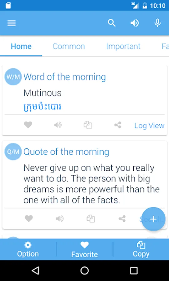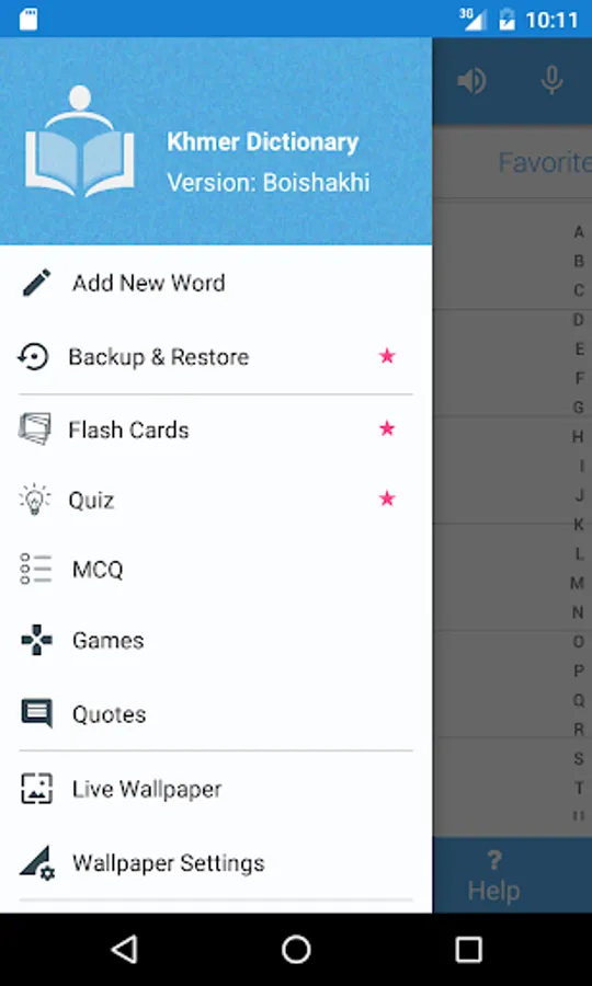 Home Screen Wallpaper: You want to learn words even if you are outside app. Yes, you are right. This is now possible with our live wallpaper feature. From drawer please select live wallpaper and you will see words with meaning on your home screen. You have lots of options to customize this wallpaper screen. Like words can be selected from favorites, history and Word of the Day section. Time frame can also be selected by you. Today, Yesterday, This week, Last week, All times and more. From wallpaper settings you can fully customize the screen. Please enable and enjoy this feature.