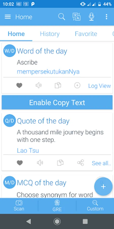 Copy to meaning (Upto android PIE): First enable Copy to meaning from the app, then while using browser or any other app just select the word or a full paragraph and copy. You will see instant translation while reading. No need to open the dictionary.