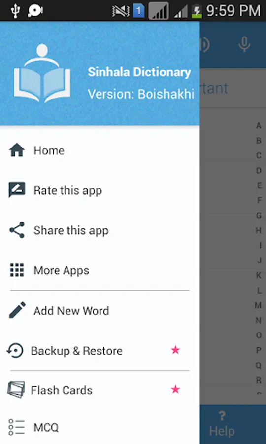 Live Wallpaper: You want to learn words even if you are outside app. Yes, you are right. This is now possible with our live wallpaper feature. From drawer please select live wallpaper and you will see words with meaning on your home screen. You have lots of options to customize this wallpaper screen. Like words can be selected from favorites, history and Word of the Day section. Time frame can also be selected by you. Today, Yesterday, This week, Last week, All times and more. From wallpaper settings you can fully customize the screen. Please enable and enjoy this feature.