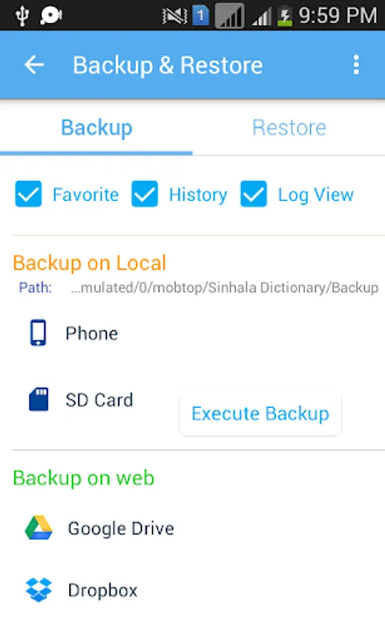 Backup & Restore: You can take backup of your history, favorite and word of the day words on SD card, on your google drive and/or dropbox account. And later you can restore any time from any place on any device as you like.