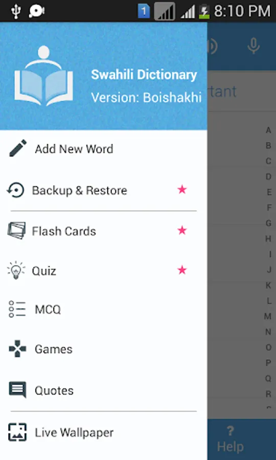 Home Screen Wallpaper: You want to learn words even if you are outside app. Yes, you are right. This is now possible with our live wallpaper feature. From drawer please select live wallpaper and you will see words with meaning on your home screen. You have lots of options to customize this wallpaper screen. Like words can be selected from favorites, history and Word of the Day section. Time frame can also be selected by you. Today, Yesterday, This week, Last week, All times and more. From wallpaper settings you can fully customize the screen. Please enable and enjoy this feature.