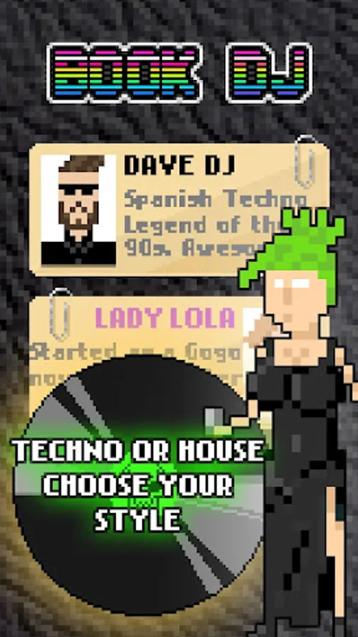 Play as Dave the DJ, a famous Spanish Legend of the 90's that has been spinning since the beginning of a more “acid” techno, based on TB303, TR808, and TR909, crushing to pure Techno mixes playing with the equalization of the more obscure and underground themes.