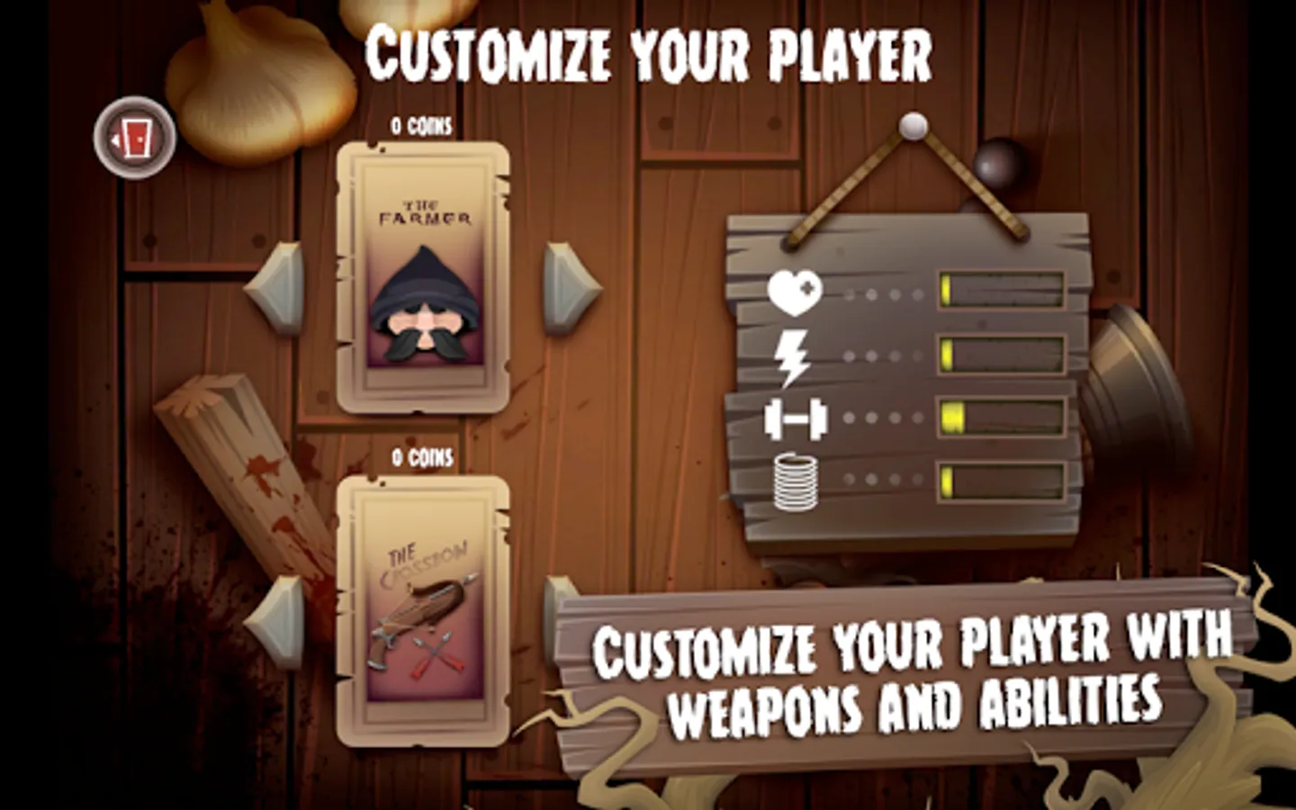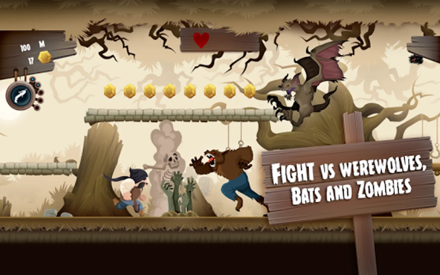 Initially your character does not have a great ability, but is able to fire his crossbow to kill vampires, zombies and werewolves. As you play you'll be getting coins that allow you to buy new weapons (try to get the wonderful STACA-Matick "Betty") and unlock new characters with better skills like Health, speed and jumping ability.