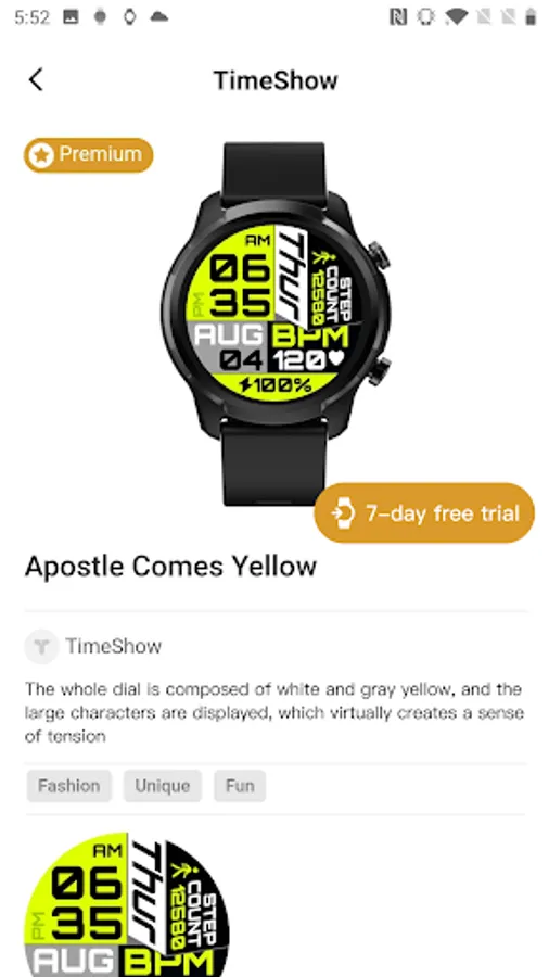 The TimeShow app supports downloads for Android phones and Wear OS watches.