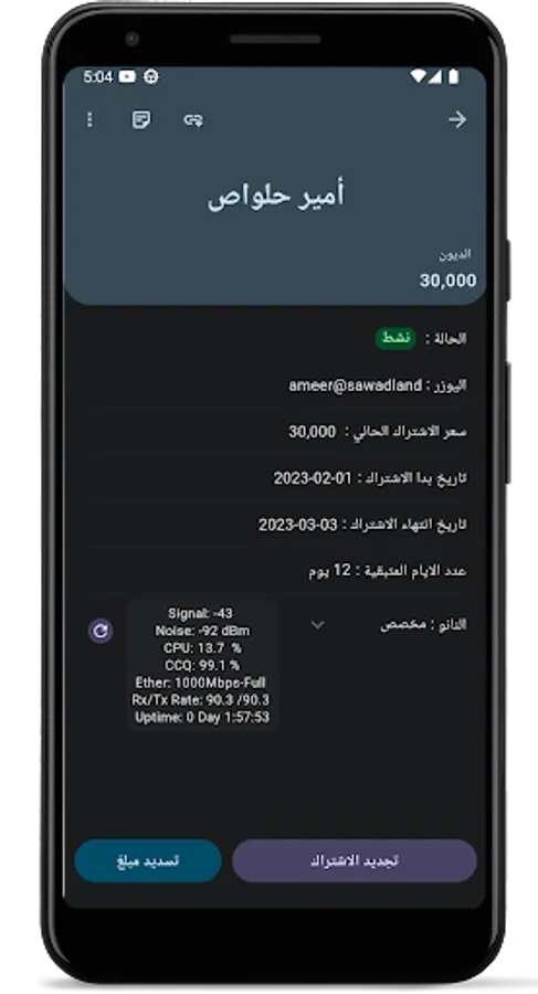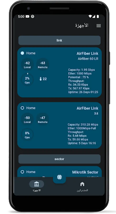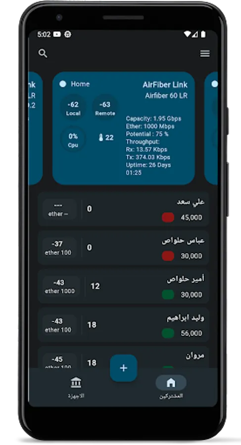 From the Devices section, you can view the hardware status of Mikrotik, Ubnt, and Mimosa. This feature provides you with important information about the tower hardware, including Signal Strength, CCQ, Floor Noise, …. You can also attach each subscriber to his nano device to view and control the device from the subscriber page.