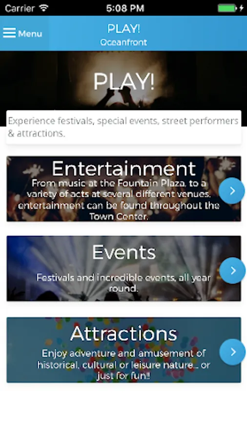 • The Menu bar in the upper left corner gives easy access to include Entertainment, Attractions, Dining, Shopping, Guest Services & Parking for the Oceanfront & Town Center