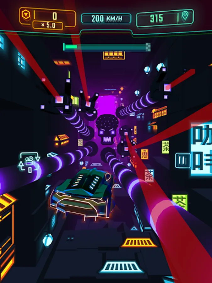 Dive into this fascinating neon world! Dodge traffic and moving bridges, fly between trains, and through giant fans. Use a shield to avoid obstacles. Watch neon signs passing by your side, while you rush forward.