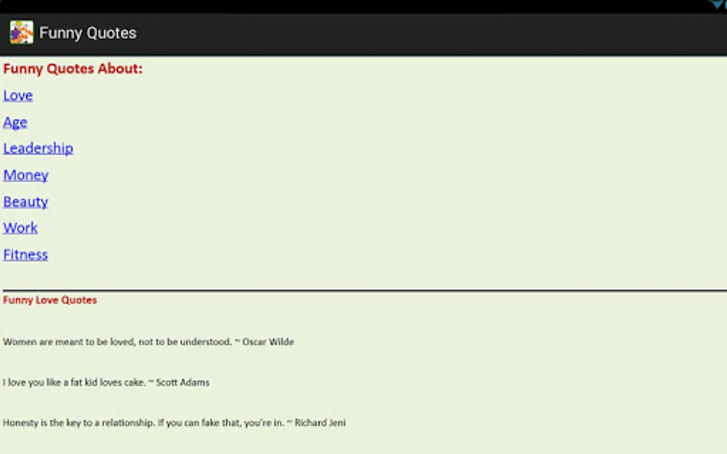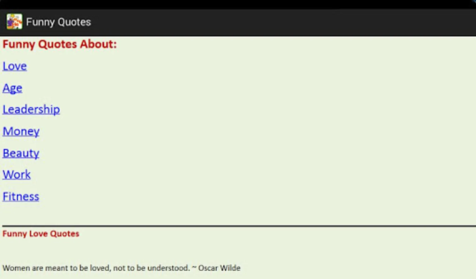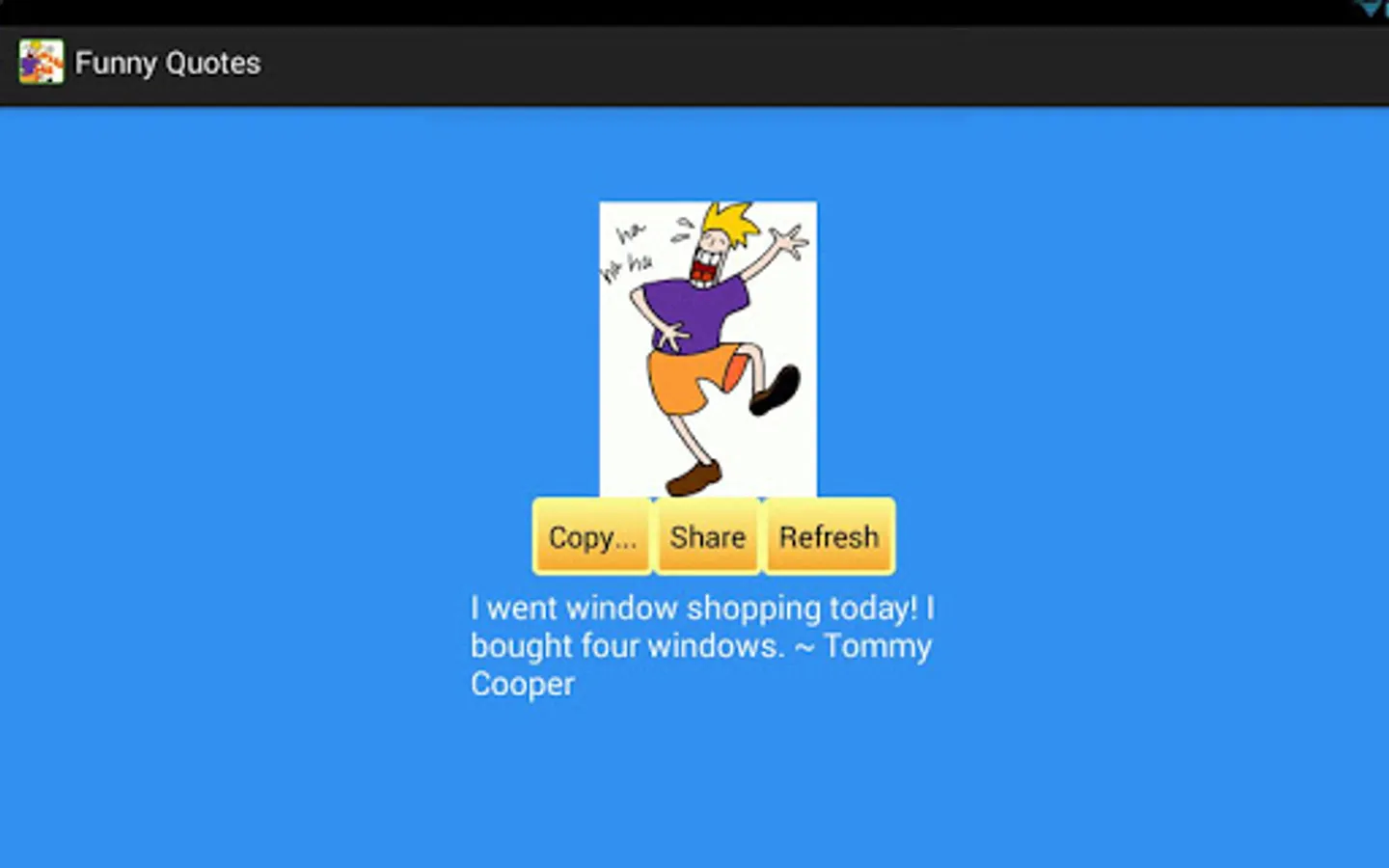 The Funny Quotes app is a collection of funny quotations, selected to tickle your funny bone. It also has a page of random humorous quotes that can be copied (and pasted) on facebook, and shared via sms, email and other social networks.
