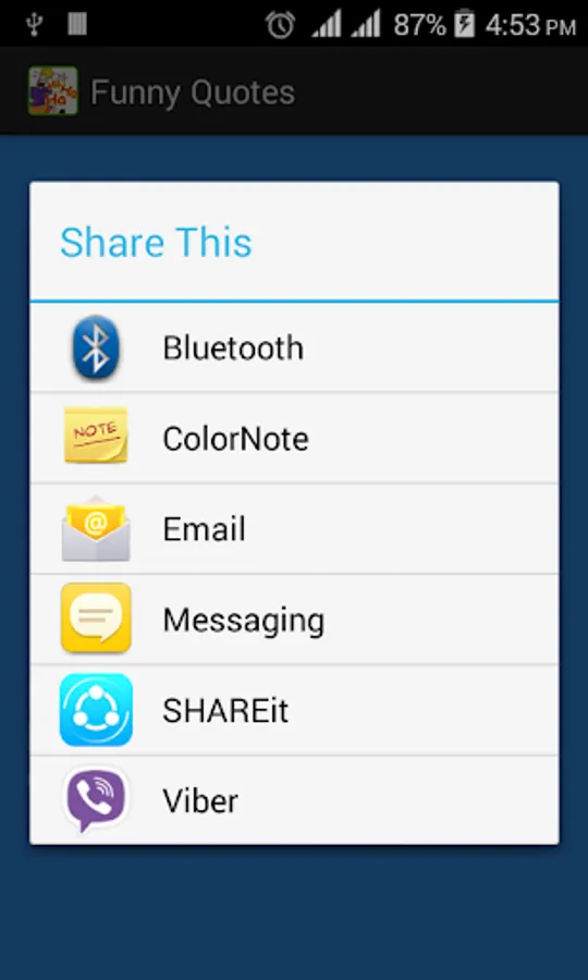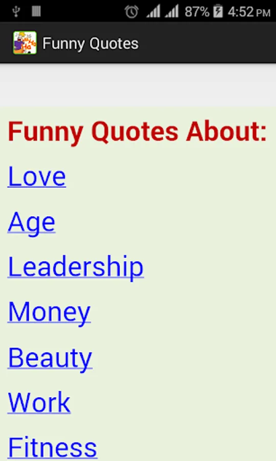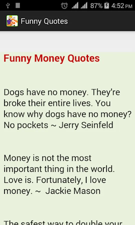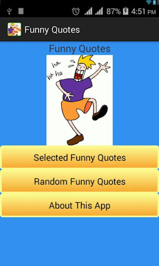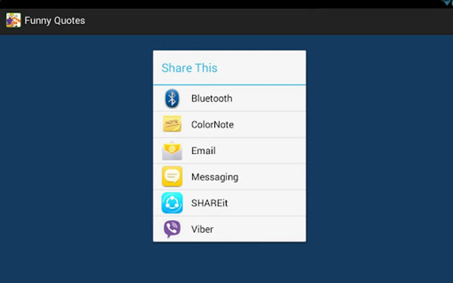 The Funny Quotes app is a collection of funny quotations, selected to tickle your funny bone. It also has a page of random humorous quotes that can be copied (and pasted) on facebook, and shared via sms, email and other social networks.