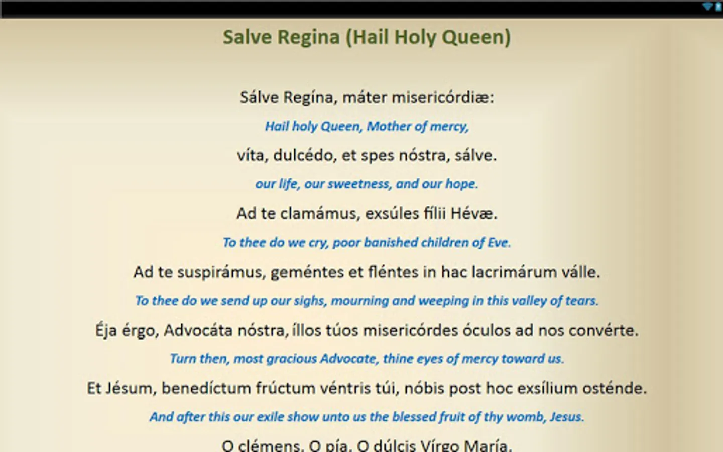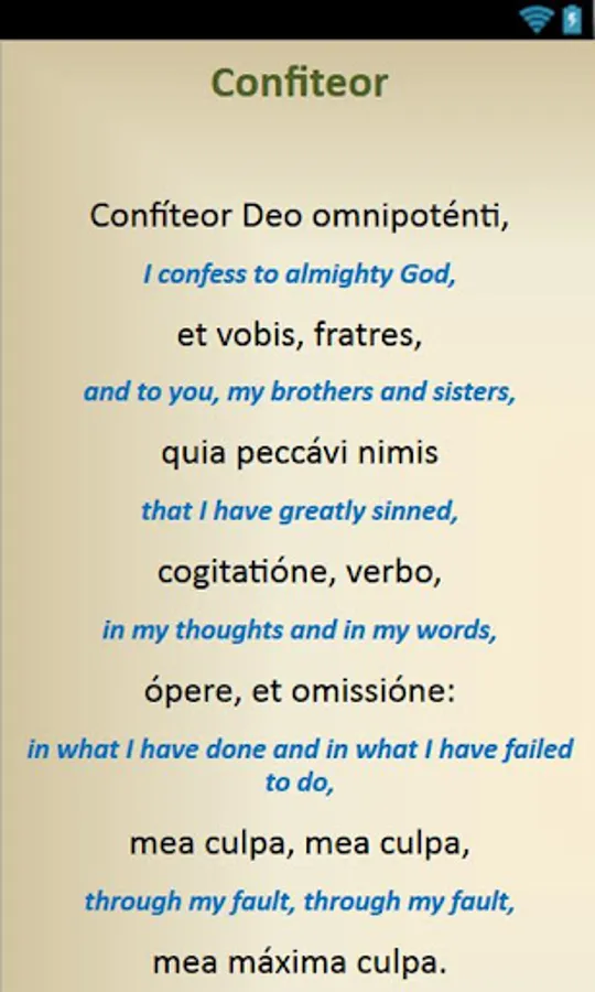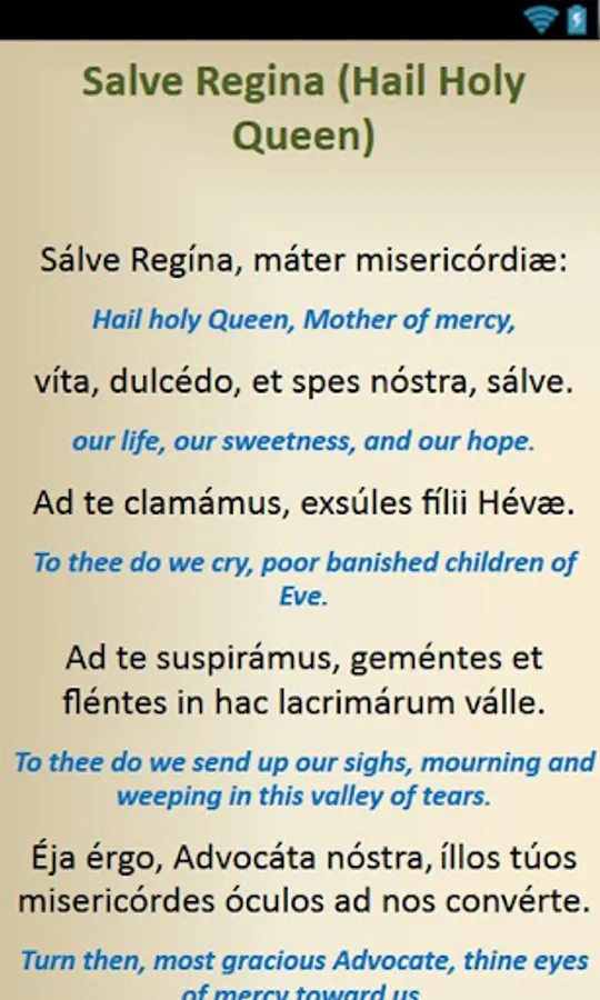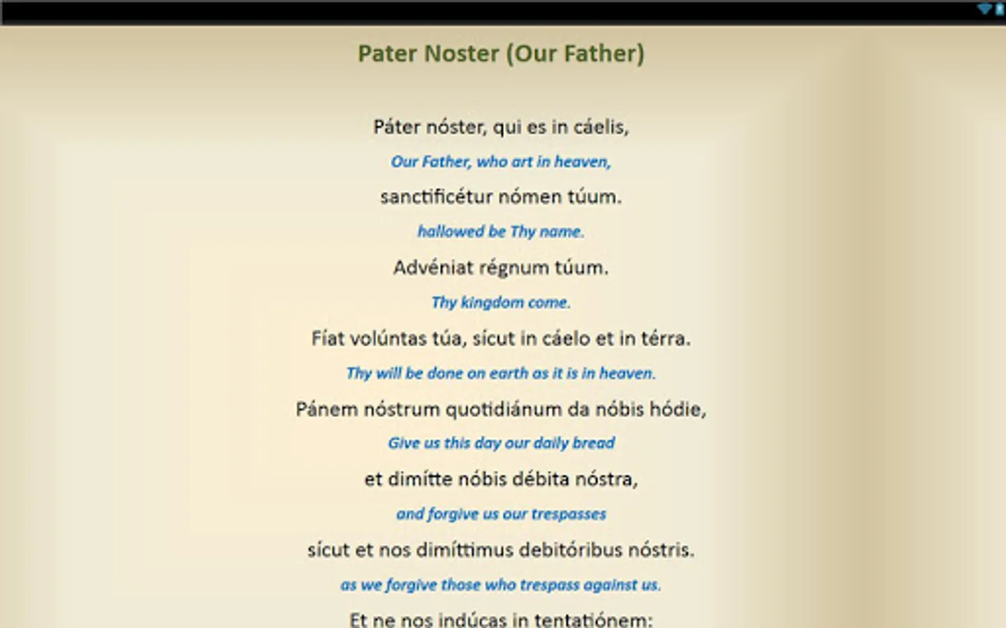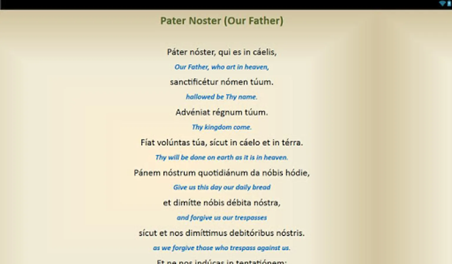 This is a free android app that contains Catholic Prayers in Latin that have English translations. Below are the prayers included: