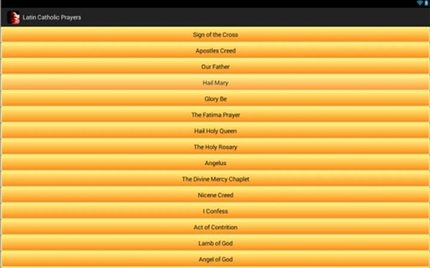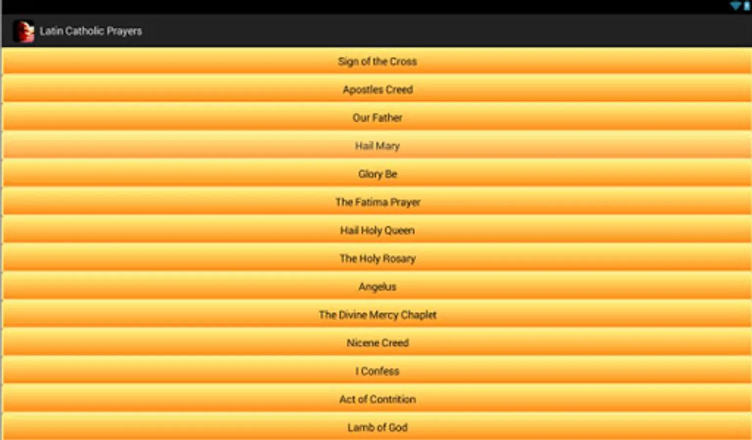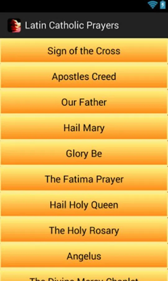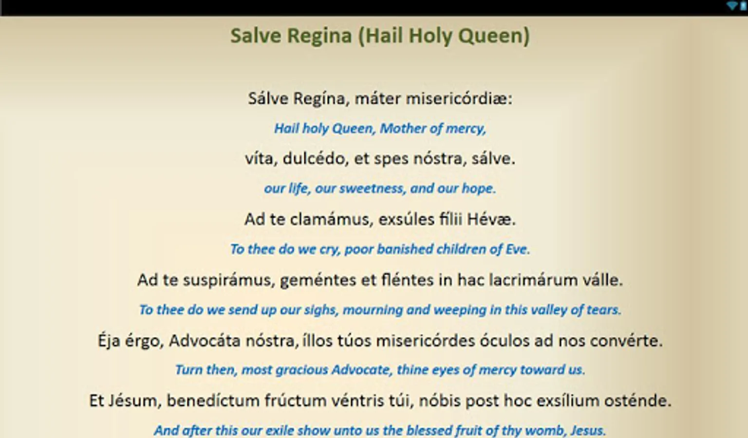 This is a free android app that contains Catholic Prayers in Latin that have English translations. Below are the prayers included: