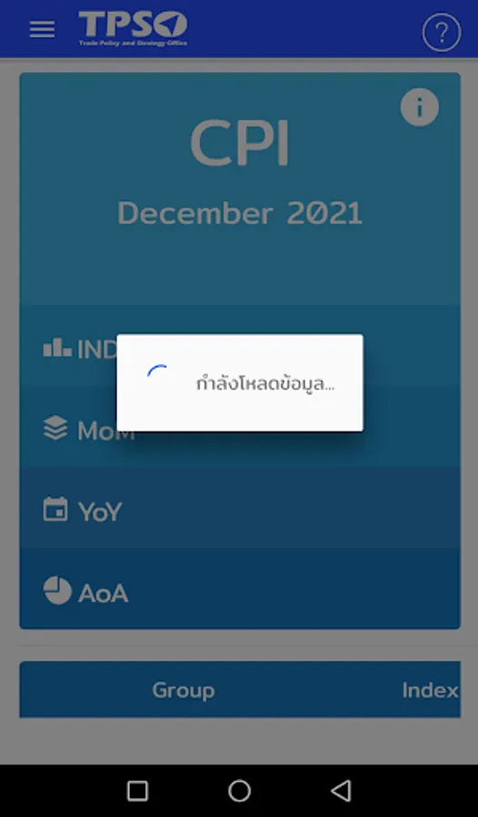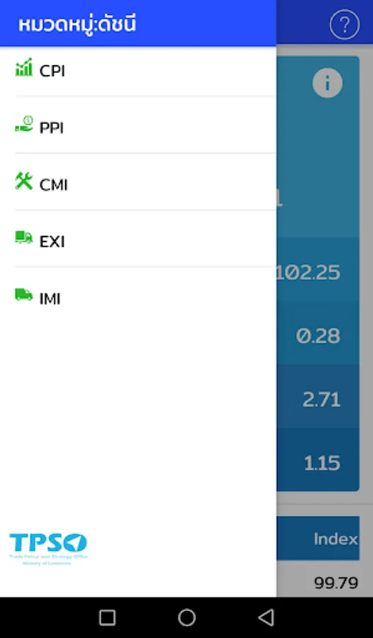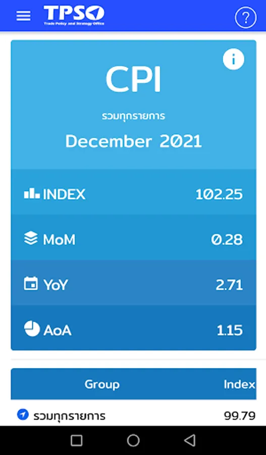 It is a system for providing information on trade and economic indices through a Mobile Application system, consisting of statistical data sets and analysis. Consumer Price Index (CPI), Producer Price Index (PPI), Construction Materials Price Index (CMI), and Export-Import Price Index (EXMI), which are statistical figures used to measure the change in the price of various goods and services. Thailand by index data set It consists of the rate of change compared to the previous month (MoM), the rate of change compared to the same month of the previous year (YoY), the rate of change compared to the same period of the previous year (AoA), as well as an analysis of the change in product prices in the form. Monthly PDF files