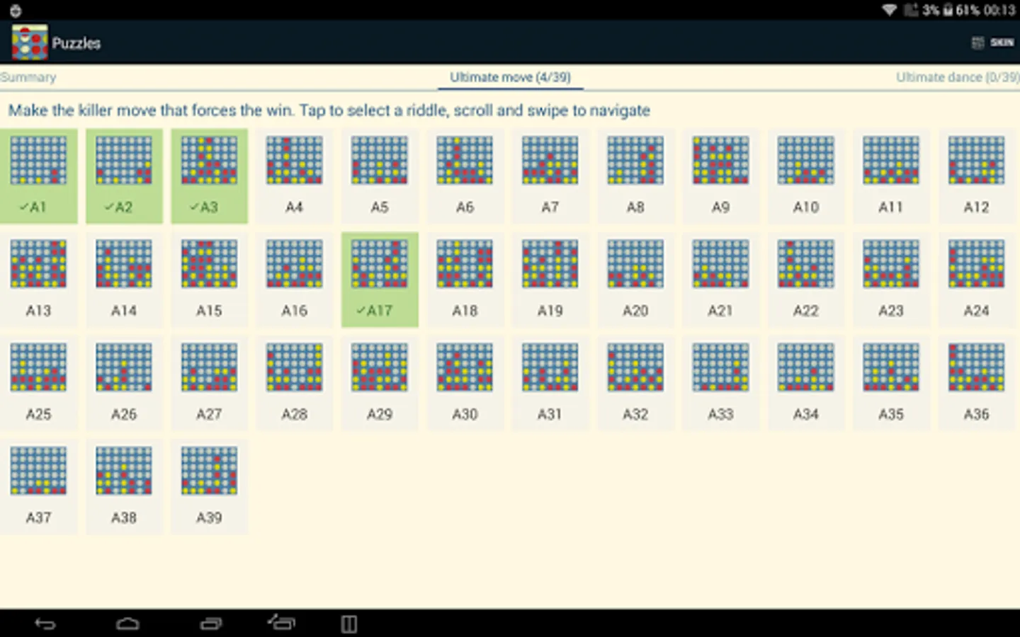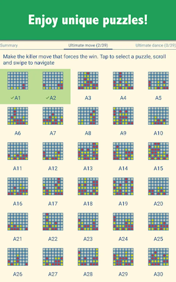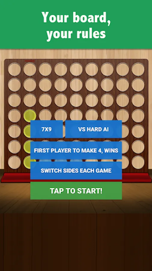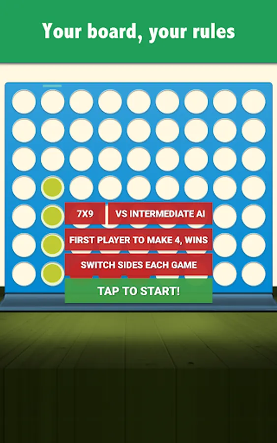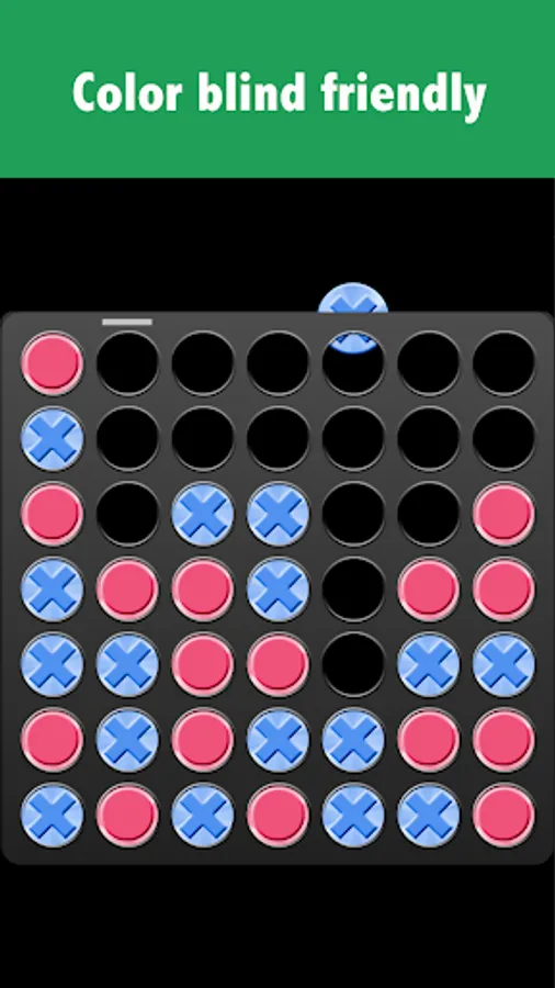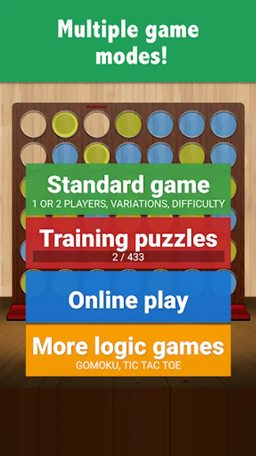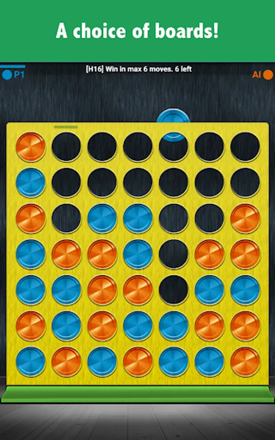 This is the gravitational four in a row where discs fall from the top and you have to connect 4 chips in a line. Should you be looking for a three in a line (aka Tic Tac Toe), five in a line (aka Gomoku) or non-gravitational connect four, try Lines & Puzzles instead: https://play.google.com/store/apps/details?id=com.mocelet.lines