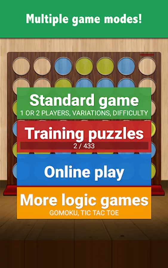 Think you know how to play four in a line? This feature packed game will squeeze your brain for hours thanks to 400+ unique puzzles that will teach you the strategy no matter your initial skill level, different rulesets and board sizes, online multiplayer, tough artificial intelligence and cool themes.