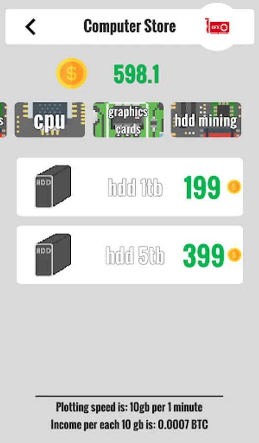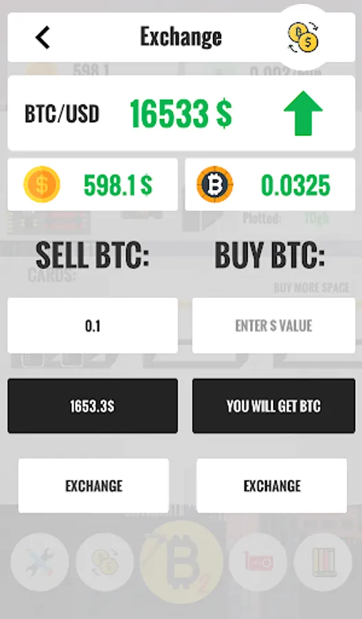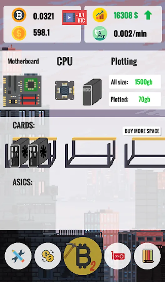 In Bitcoin Clicker Miner Tycoon 2 you can build your mining farm! Earn bitcoin -> exchange them to dollars in dynamic stock exchange -> buy more graphics cards, processors -> mine more bitcoins.