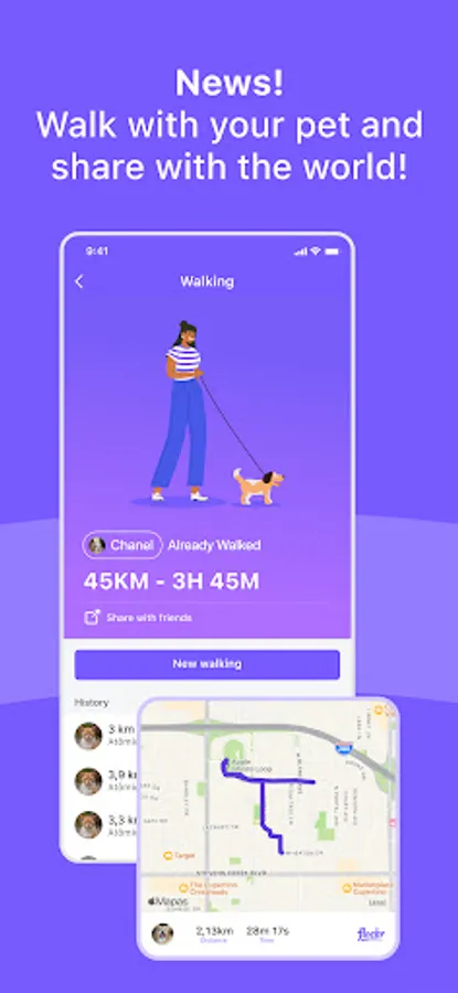 > Walk with your pet is very important, in Flock we motivate you to do walking with a feature that allows you to share your walking with your friends.