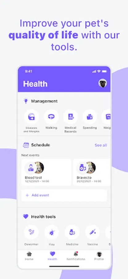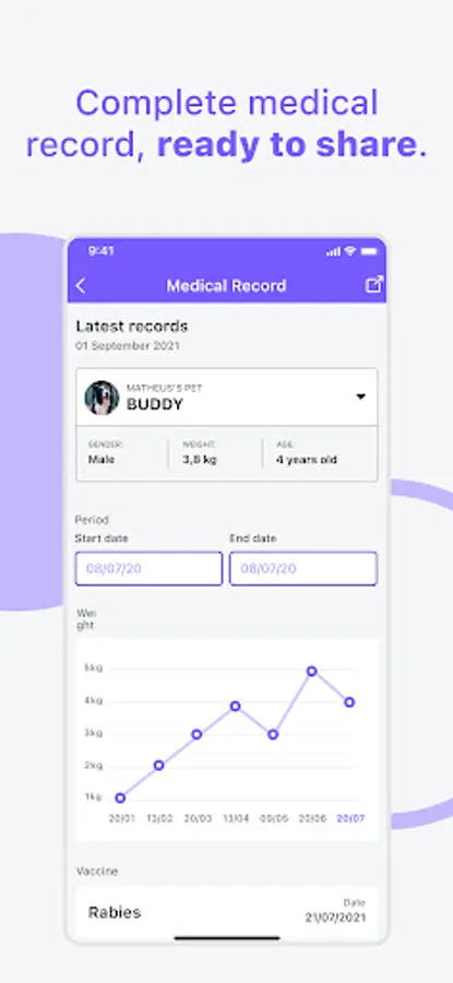 > Track all health records of your pet: weight, diseases, illness, allergies, grooming, and vet appointment history.