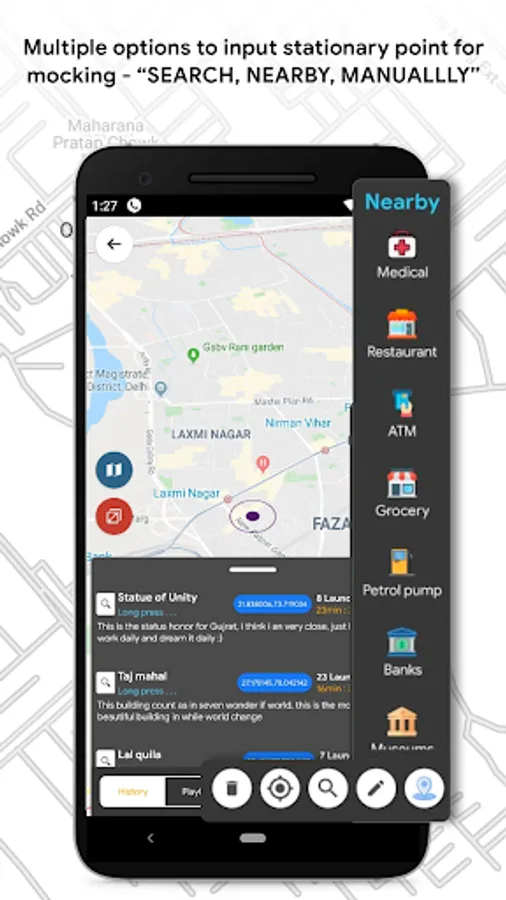 Using Mock Loc you can teleport your phone with total control over GPS signal accuracy in the world with just some clicks. This app sets up fake GPS locations so that every other app on your phone belives you are there. Simply select the point you want to fake (or inject) into the phone and press the play button, There are many ways to select a point for faking location, also this app has an automated feature that store manages the history according to your previous selected point. You can add any point as a favorite and also add notes to that specific location