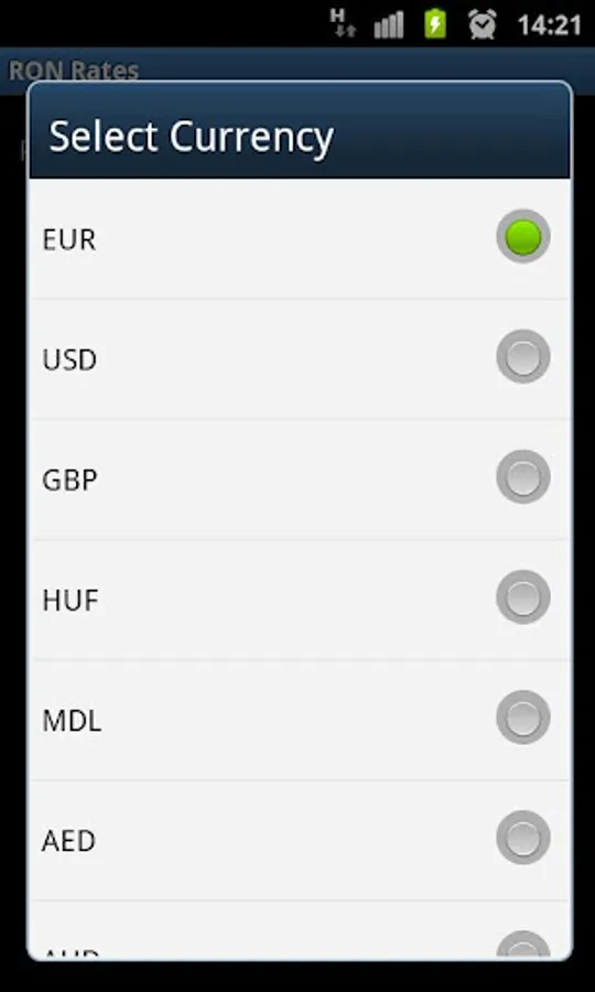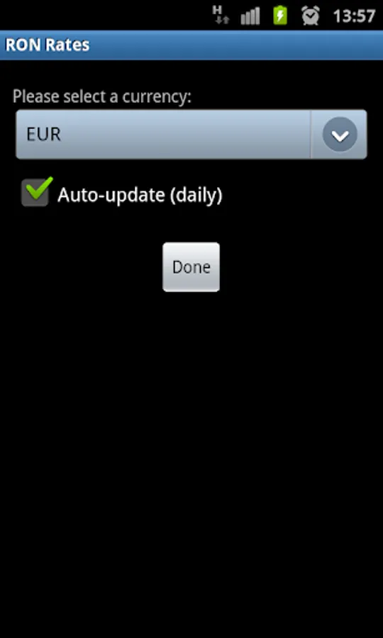 Widget that displays various RON (romanian leu) exchange rates. The data is retrieved from BNR website. You can have more widget instances on your screen, one for each currency.