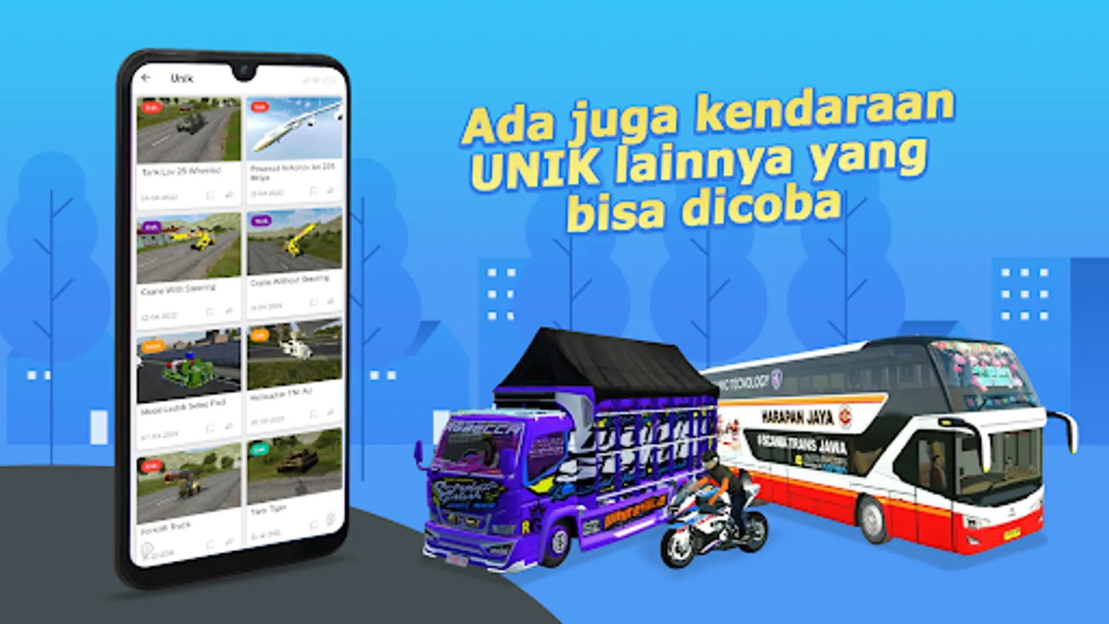 In this application we have provided hundreds of MOD and BUSSID Livery with various types such as Bus (HD, MHD, SHD, HDD, UHD, DD, XHD, Jetbus, JB3 +, Jadul, Avante, Bumel, Zeppelin, Evolander), Truck (Canter, Fuso, Hino, Volvo), Cars (Lamborghini, Toyota, Honda, Sport) and many more that we will add later for you to download directly without fuss.