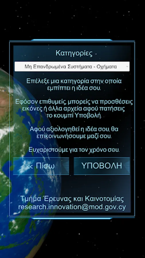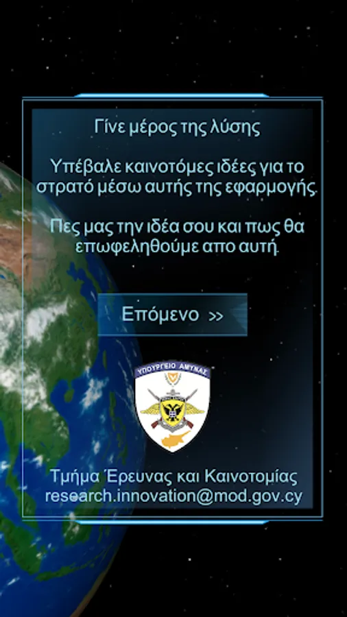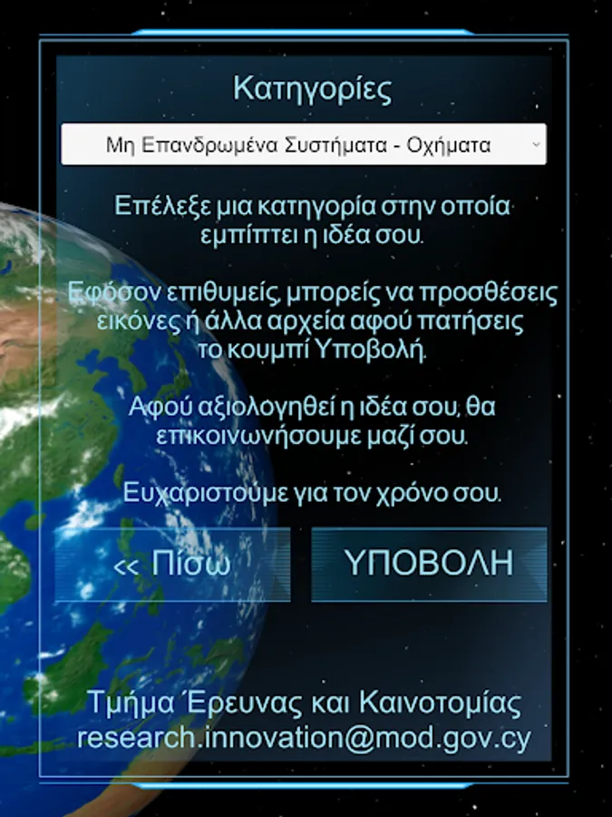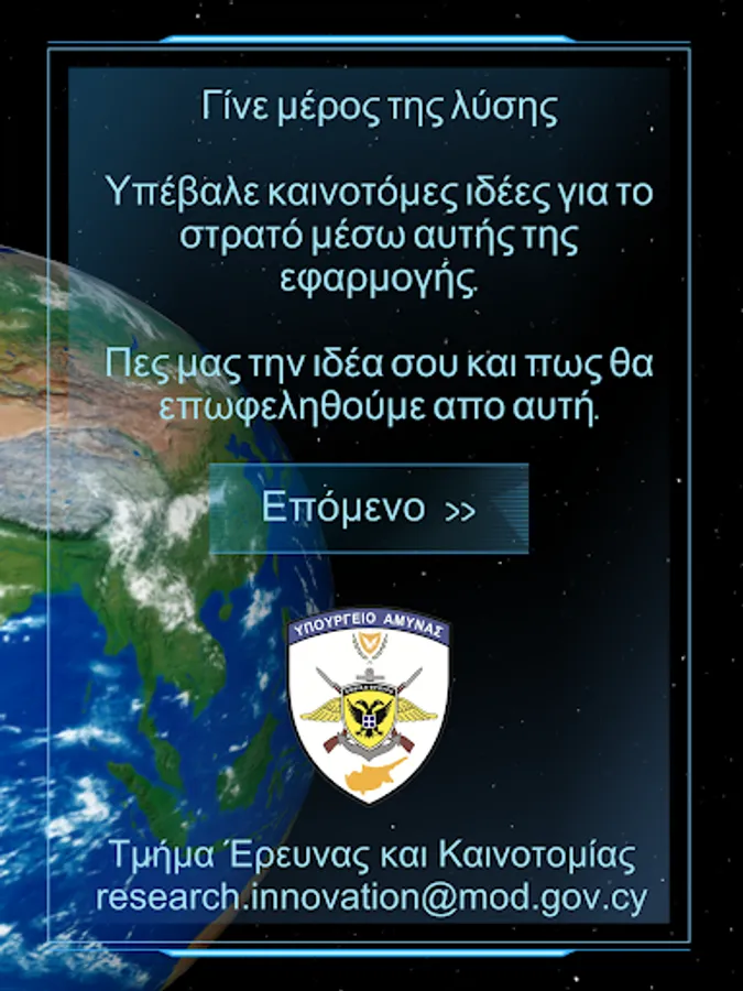 Πρόθεση του Υπουργείου Άμυνας μέσω αυτής της εφαρμογής είναι να ενθαρρύνει το κοινό για την υποβολή καινοτόμων προτάσεων.