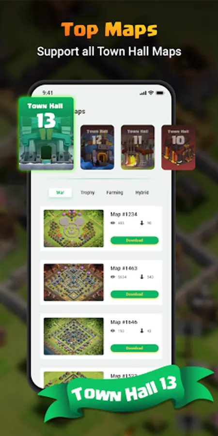 The app contains maps for town hall level 6 to town hall level 11.