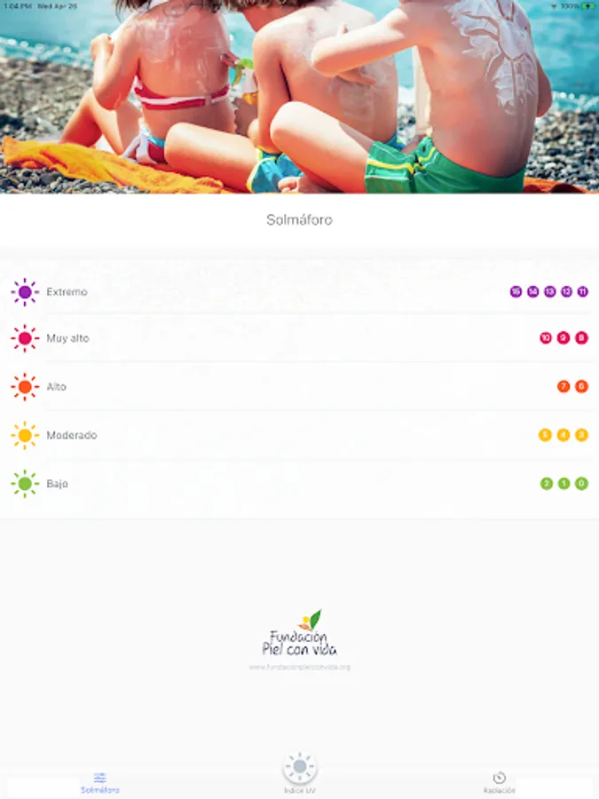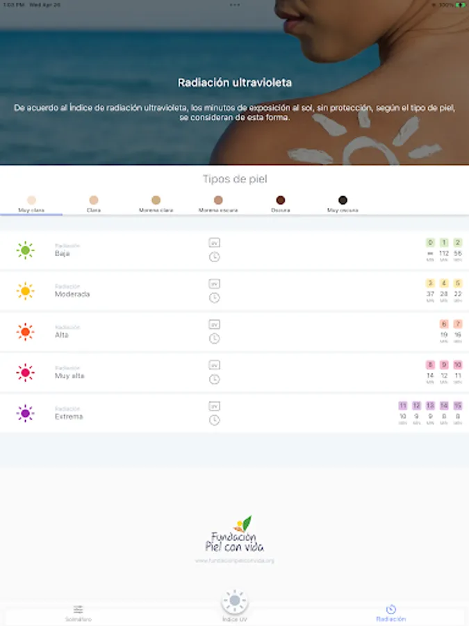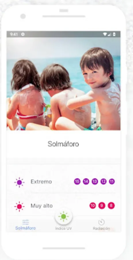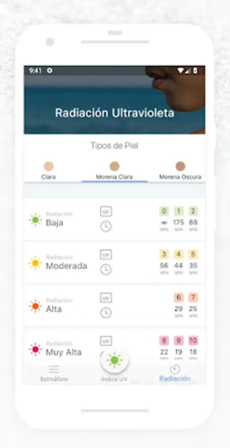 Solmáforo App informs you about the current Ultraviolet Radiation Index "IUV", search by location in real time from anywhere in the world, according to the UVI and the minutes of exposure to the sun, without protection, depending on the type of skin.