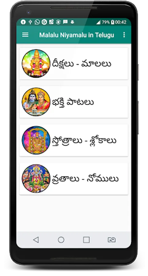 This app contains Malalu, Deekshalu, Bhakti Patalau, Vrataalu, Nomulu, Stotraalu, Slokalu information.