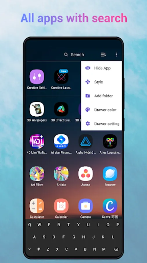 Creative Launcher ❤️ is a unique launcher with innovative features, its drawer have smart A-Z keyboard to help you find and open apps very quickly, it is a quick and smart launcher, it also has many launcher features like other normal launchers.