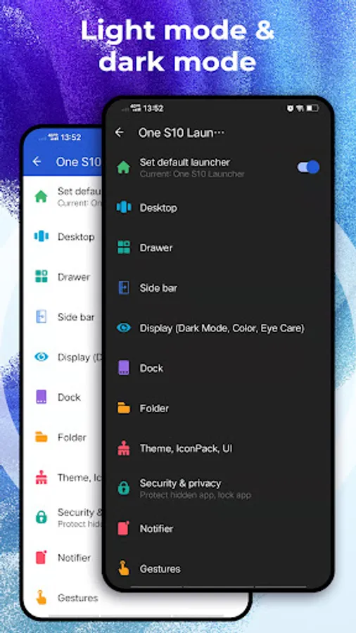 + One S10 Launcher support 3 color mode: Light, Dark, Auto Adaptation