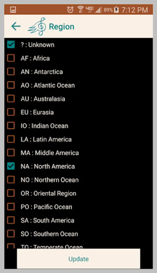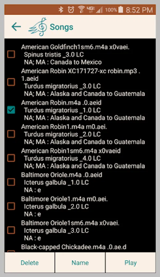 3) In Birding Via Mic_YourRegion tap Songs button and verify a list of songs is displayed