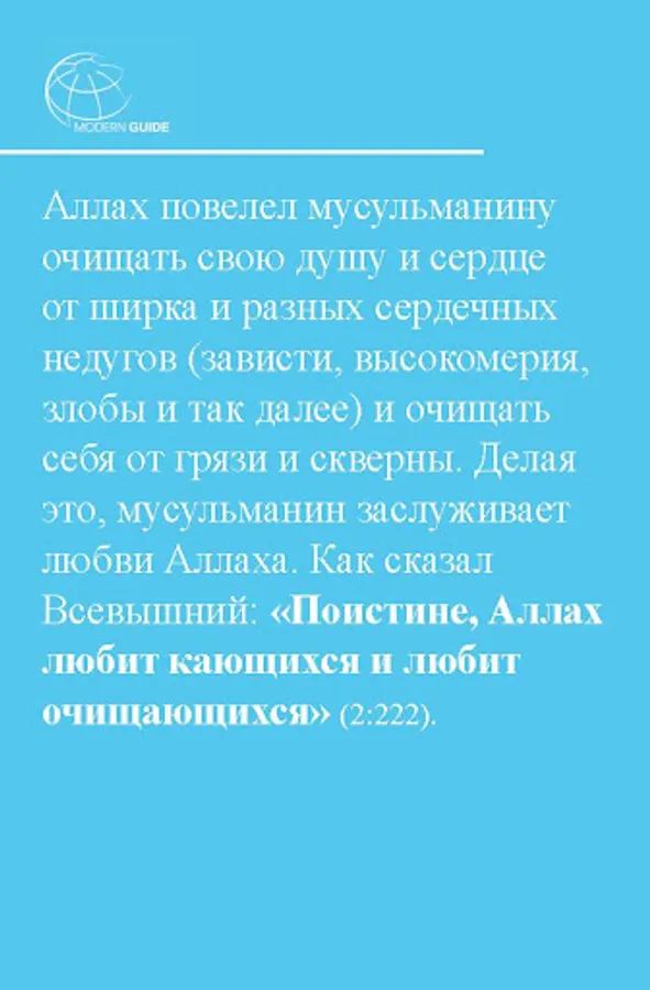 Here you will find an explanation of the importance of cleansing in the life of a Muslim, together with an explanation of the concepts of "cleansing" and "desecration" as well as an explanation of how a Muslim should be cleaned of contamination and perform ablution (wudu). It also provides some of the rules of Sharia associated with cleaning, in an entertaining and accessible way.