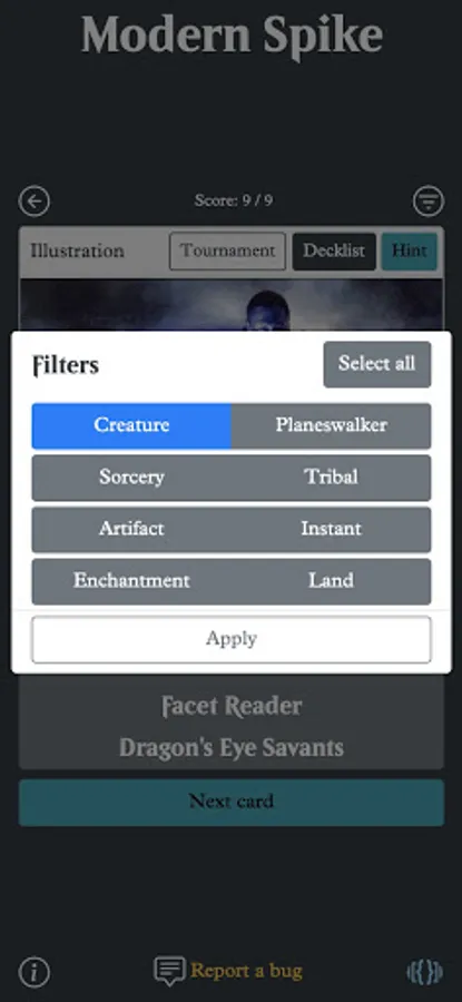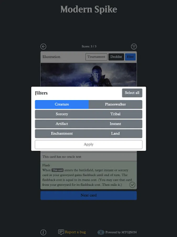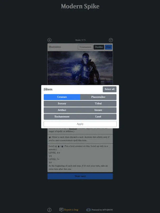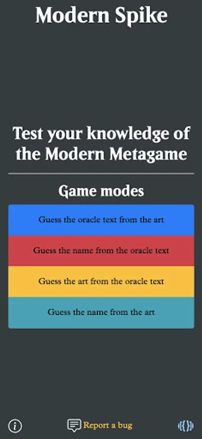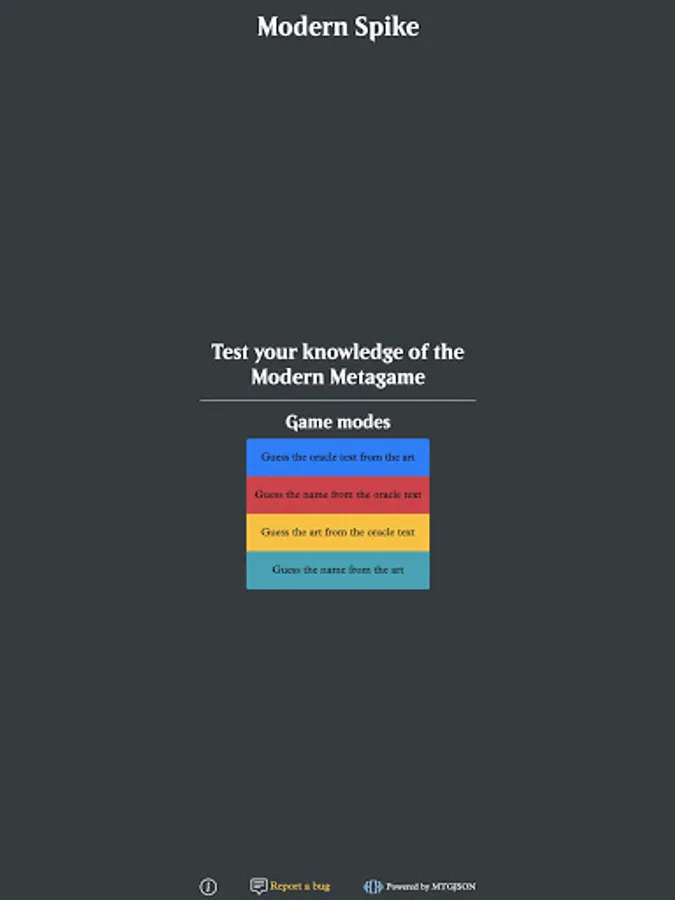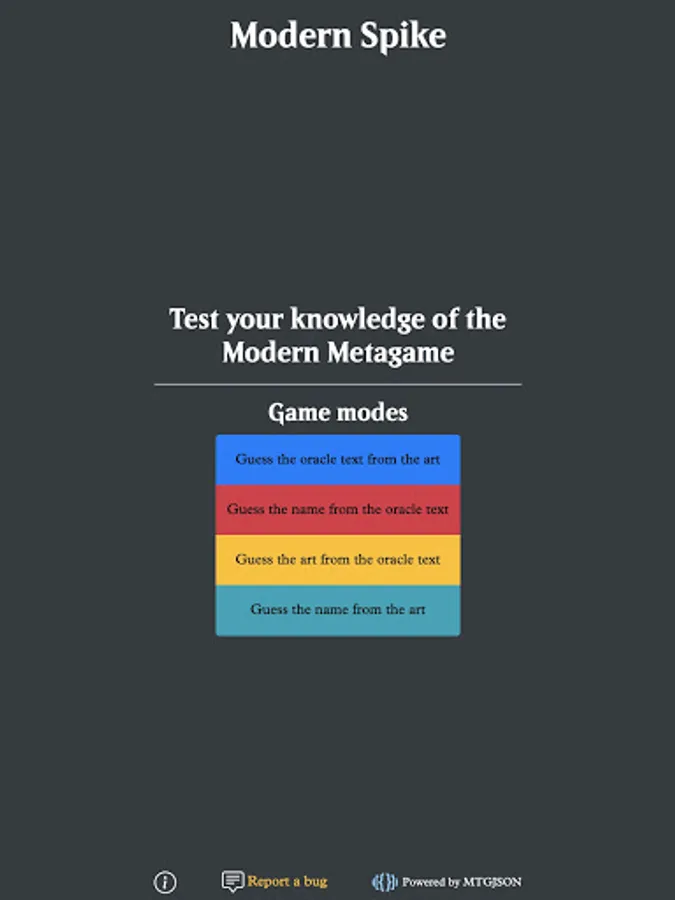The Modern Spike is a simple Magic the Gathering flashcard game that tests your knowledge of the Modern format card pool. The app helps you get familiar with the current Metagame by showing you cards that have been played in the most successful decks in the last seven days.