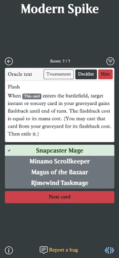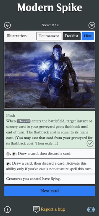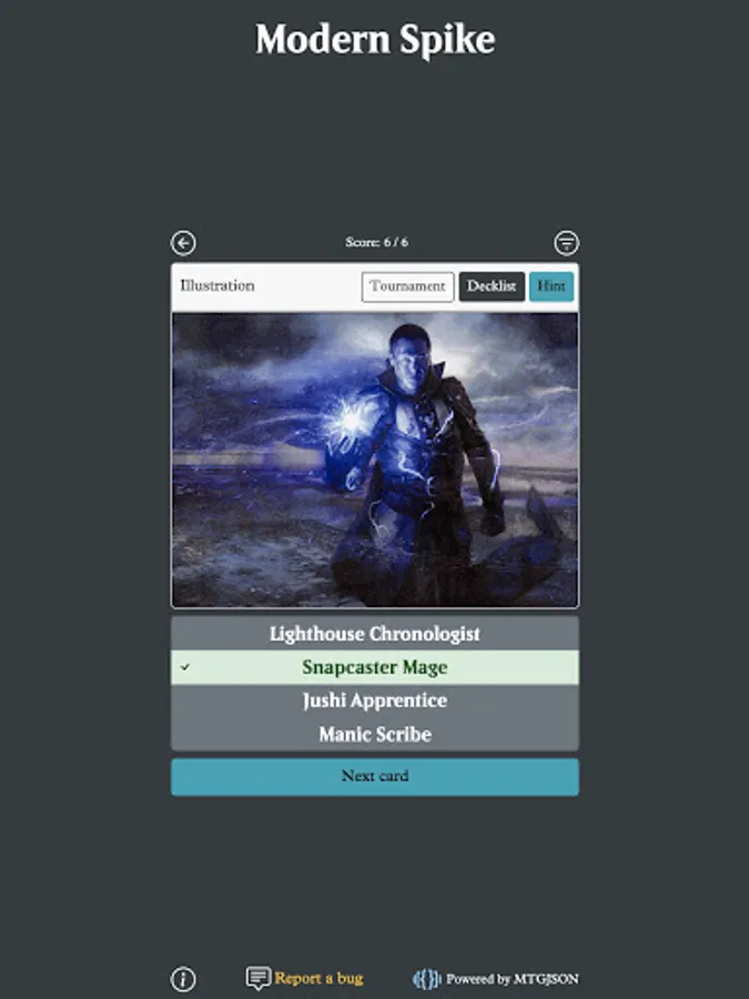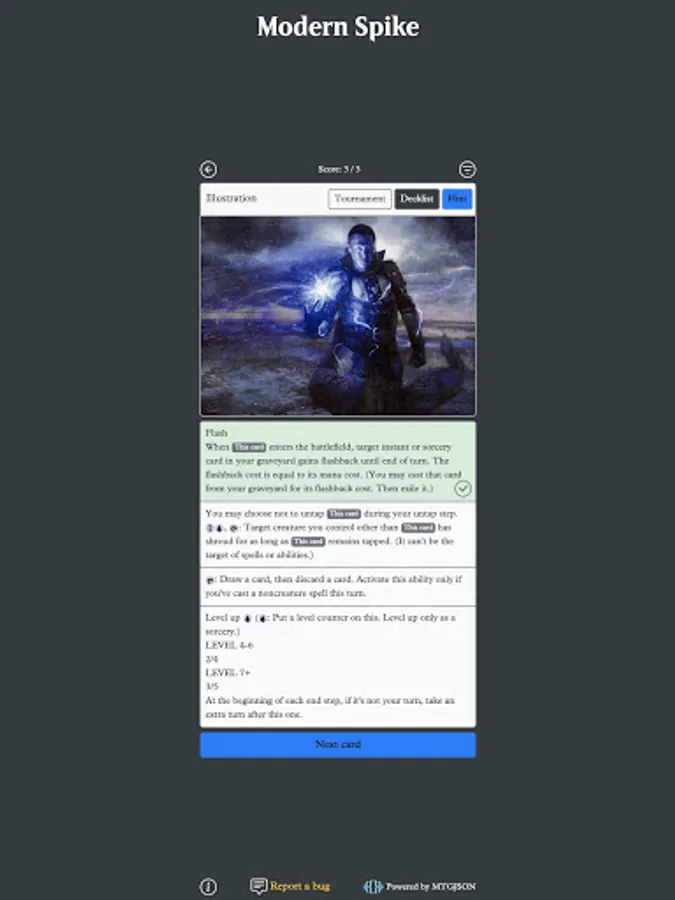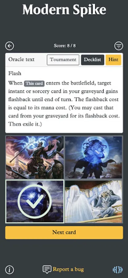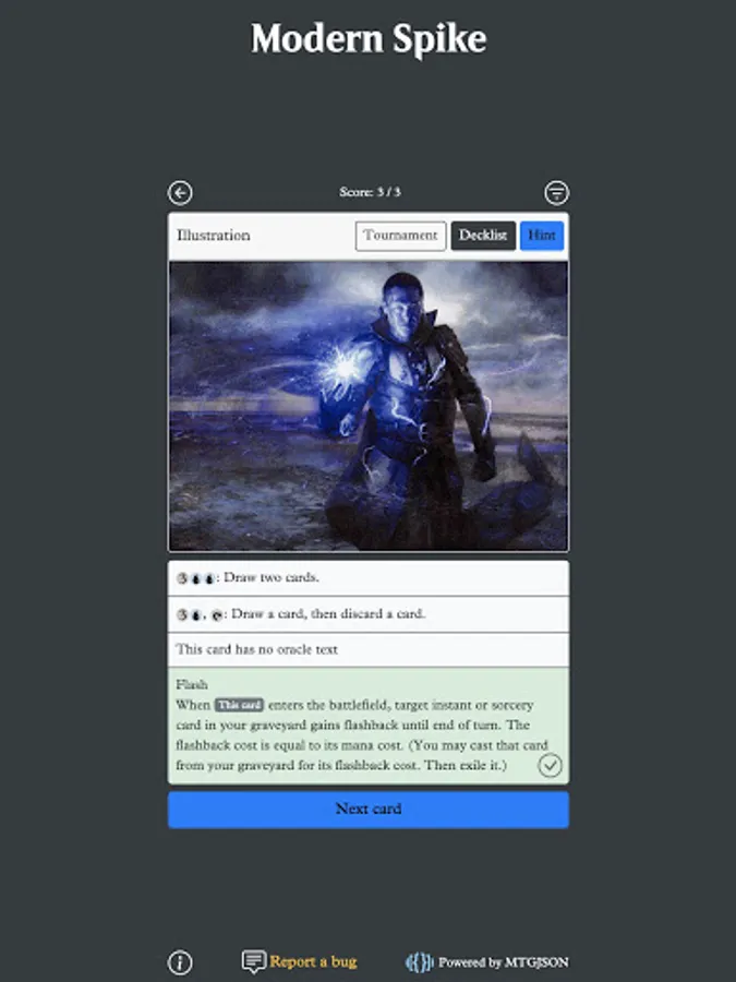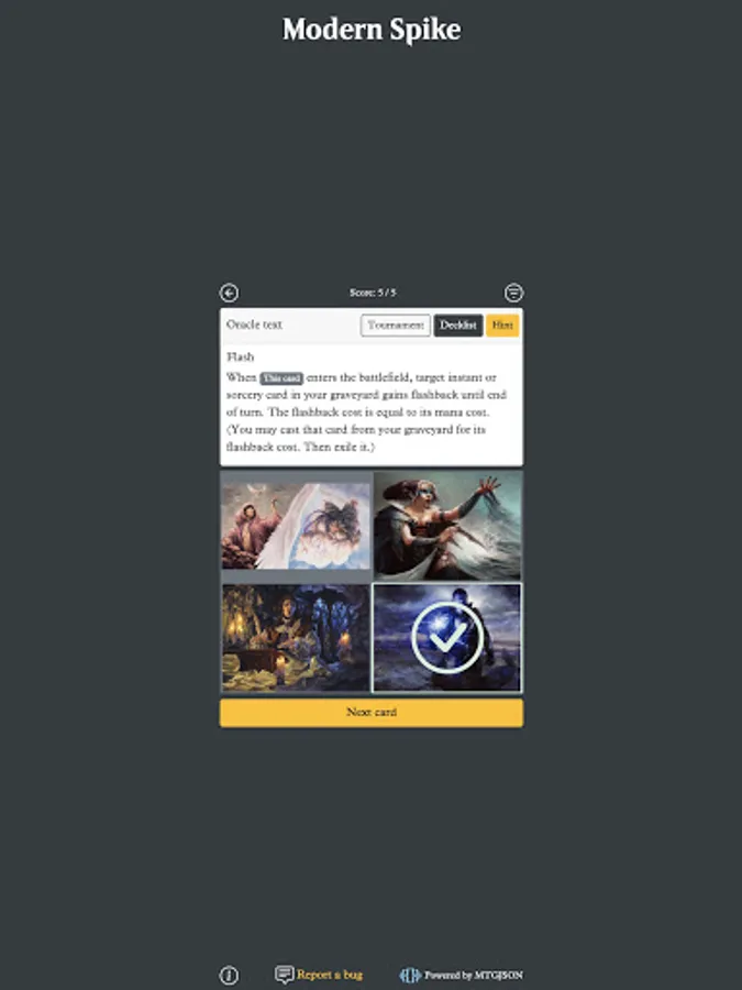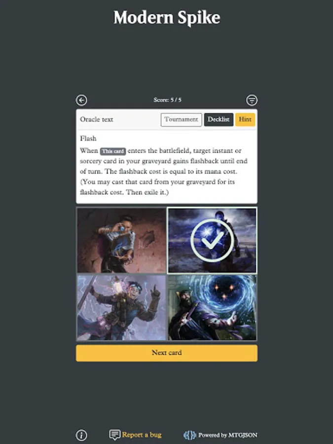 Guess the oracle text from the art in which you are presented with the artwork of a random MTG card that appeared in one of those tournaments and four different oracle texts to choose from.