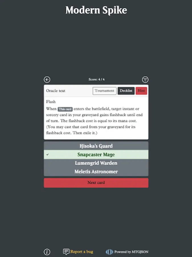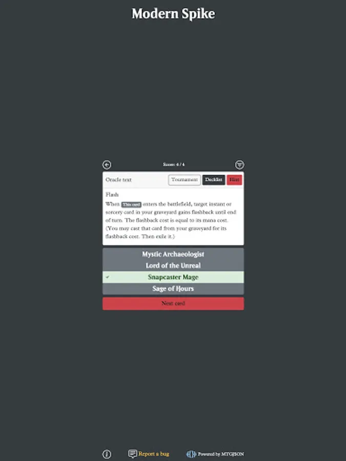 Guess the name from the oracle text in which you are presented with the oracle text of a random MTG card that appeared in one of those tournaments and four card names to choose form.