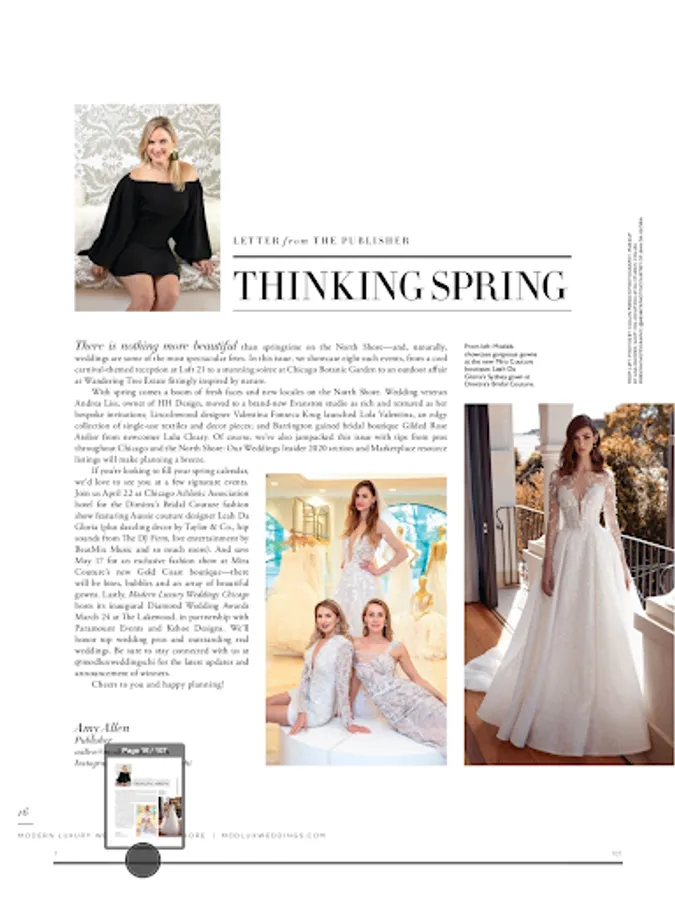 Every issue features an insider’s look at the most glamorous wedding venues, wedding shops, and planning advice that the North Shore has to offer and includes photos and editorial covering couture wedding fashions, sparkling jewelry, debonair menswear, enchanting wedding sites, over-the-top catering, cakes, trendsetting flower and event design, invitations, and much more.