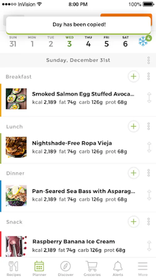 With our built in meal planning tool you can easily view all of your weekly meal plans, and even add new recipes as well as move recipes from one dish to another with just a single click.