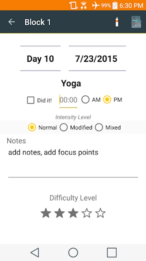 ✓ Rate the difficulty level of workout. This does change even for the same workout - explain in your notes.