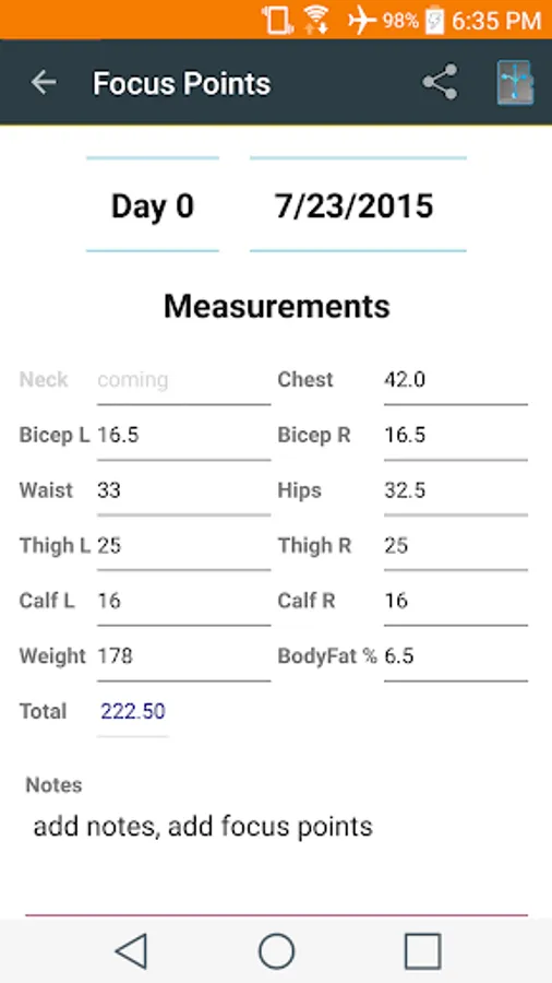 ✓ Total Measurements: Automatically calculates/tracks measurements to show overall change. *All measurements should be whole numbers or numeric decimal only - no commas. 25.00 not 25,00 - having trouble filtering some European keyboards.