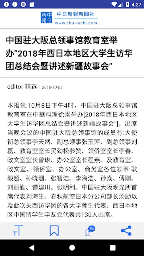 该报以为中日政治、经济、文化交流 牵线搭桥为创刊宗旨。以公正、客观、迅速、高格调为报道宗旨。 《中日新报》总社设在大阪,在东京、名古屋、福冈设有支局,负责全日本的新 闻、时事采编及广告业务。