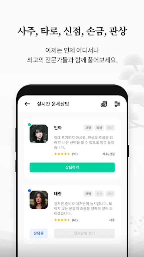 Select the desired consultation among four weeks, tarot, palmistry, contemplation, and new store and apply for one-on-one consultation by voice, chat, or video.