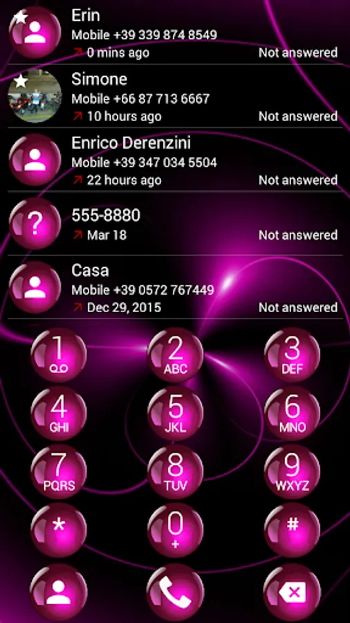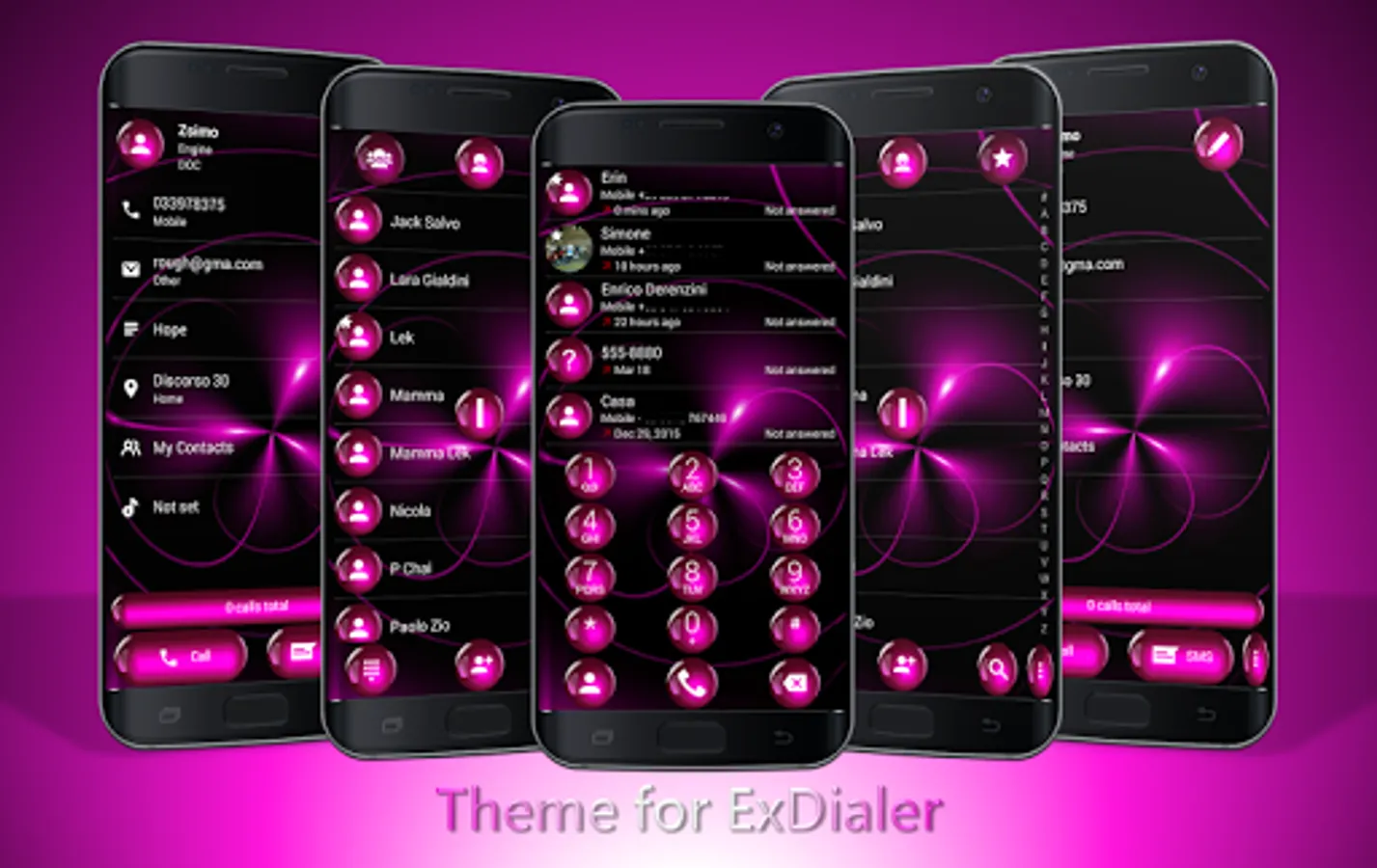 This is a black and pink theme for Drupe or ExDialer - Dialer & Contacts (com.modoohut.dialer) application.