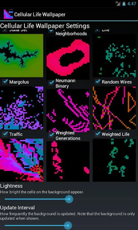 A live wallpaper celebrating cellular automata, which are kind of like 0-player games; this is perfect for a background that you don't interact with.