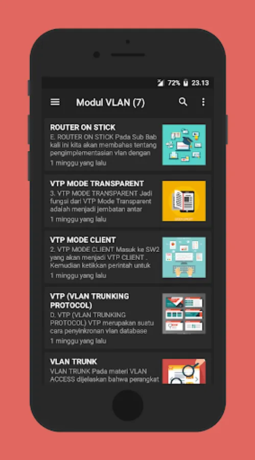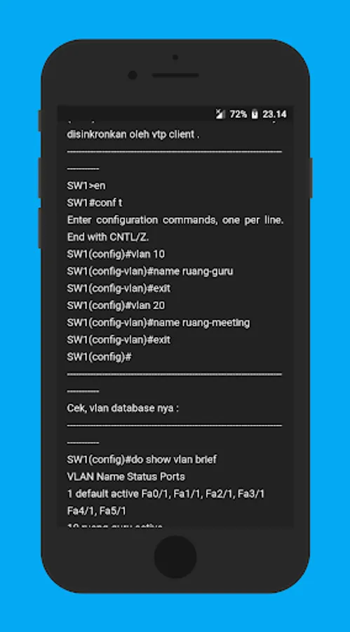 Aplikasi versi 1.0 ini berisi materi mengenai modul VLAN (Virtual Local Area Network) memudahkan siswa dan guru untuk pembelajaran, dimana di dalamnya di sediakan teori pembahasan dan praktikum siswa
