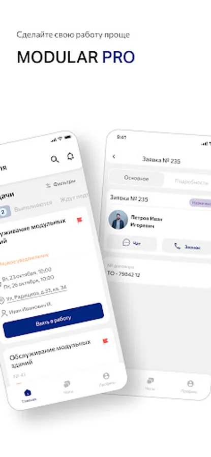 All applications, work schedule and acts of work performed in the Modular Pro mobile application for Modular employees.