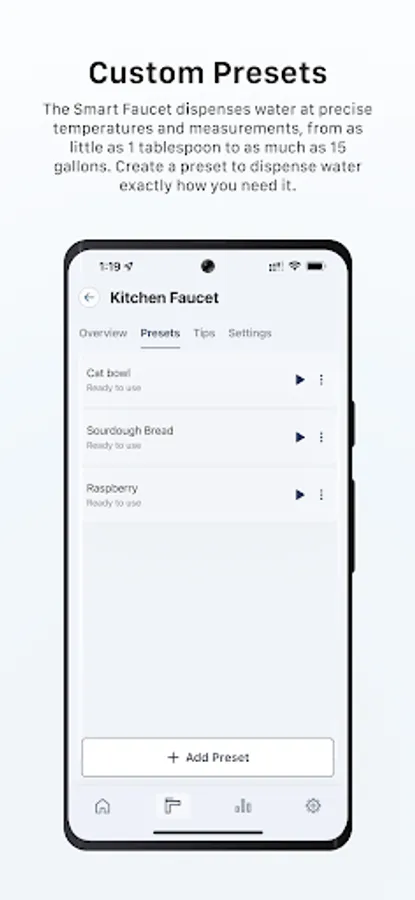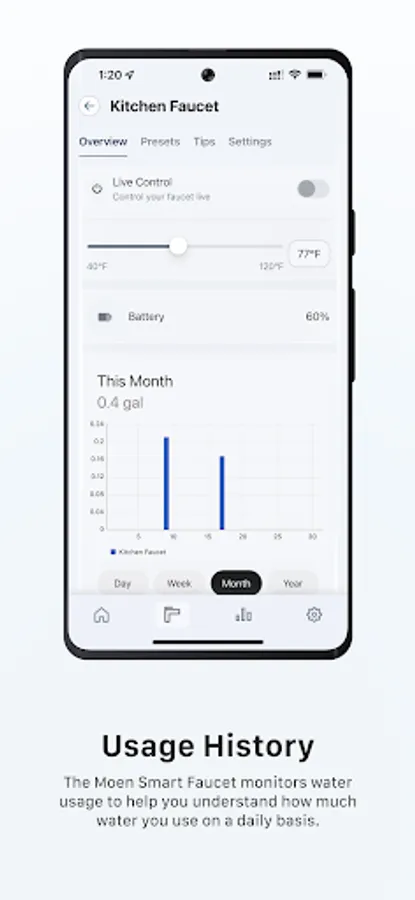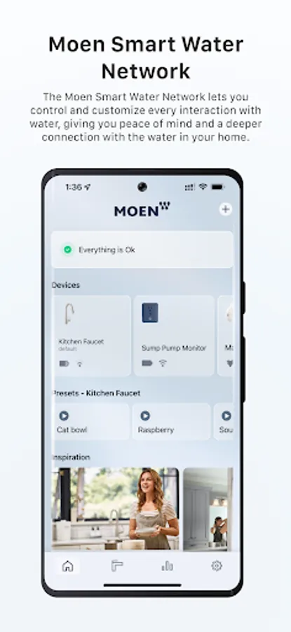 • With the Moen Smart Water app, you can create unlimited custom presets for your everyday tasks, track water usage and adjust faucet settings for a personalized experience in the kitchen.