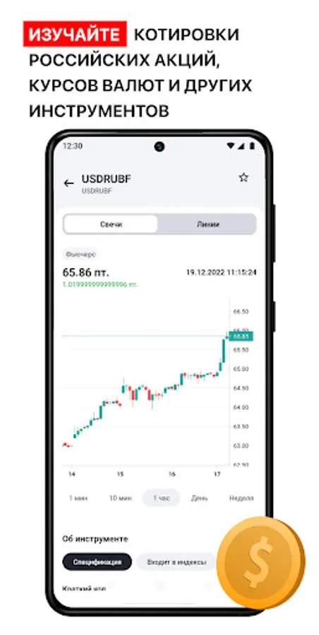 The application has a section with quotes for financial instruments that are traded on the Moscow Exchange.